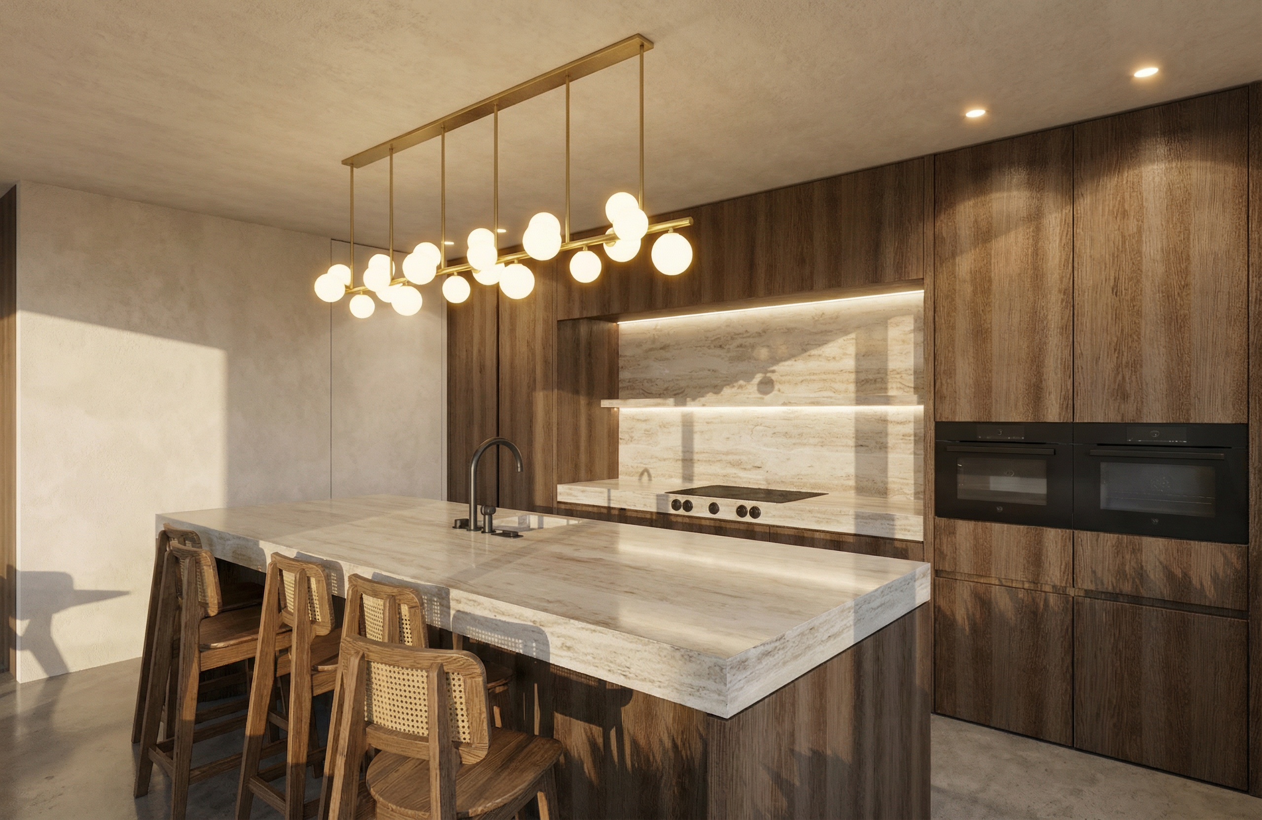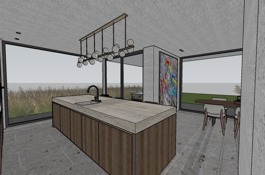 add lighting wood is dark oak make it very photorealistic darker wood and lighter ceiling please add trees in backgground