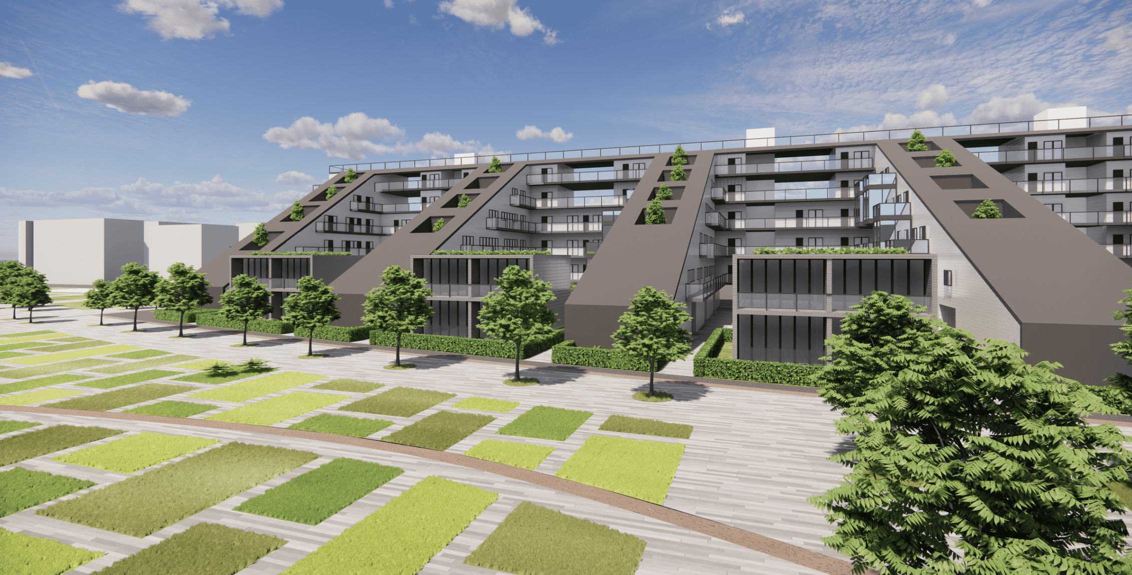 exterior shot facade has to be white roof elements with struchture like trapezblech dach wei