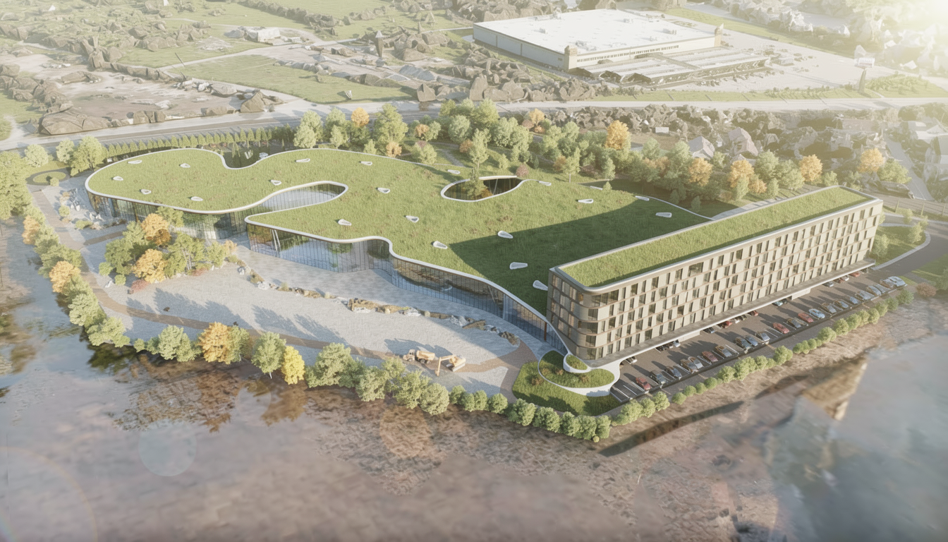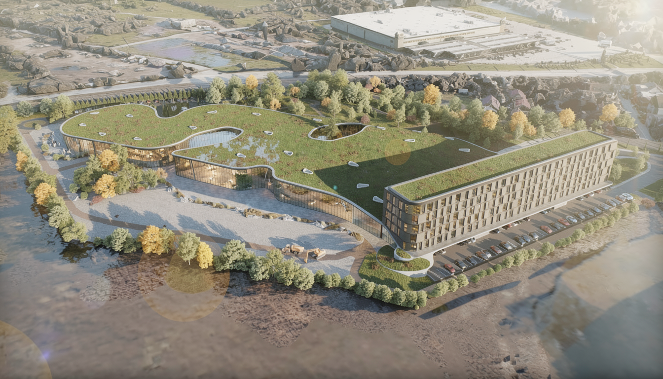 mportant preserve the existing geometry and the existing context exactly as provided preserve the existing windows do not add new windows do not modify alter reinterpret add remove scale or reshape any geometry do not change the site surroundings street layout neighboring buildings vegetation or context elements do not modify geometry scale proportions buildings road layout sidewalks or surrounding context in any way do not modify text soft sunny noon atmosphere diffused neutral natural daylight with subtle tones cinematic architectural mood large glass surfaces with realistic reflections soft mirror effect environmental reflections of sky and surroundings important do not add new windows remove the haze remove the lens flare do not add lens flare do not add haze remove the lens flare