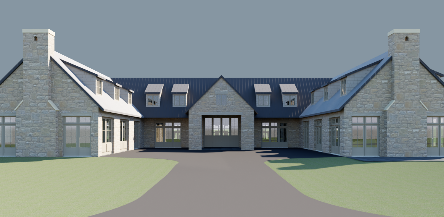 equetrian french country garage and guest house in northern wisconsin with woods in background full stone exterior rough hewn wood headers over all windows and doors graphite colored standing seam metal roof