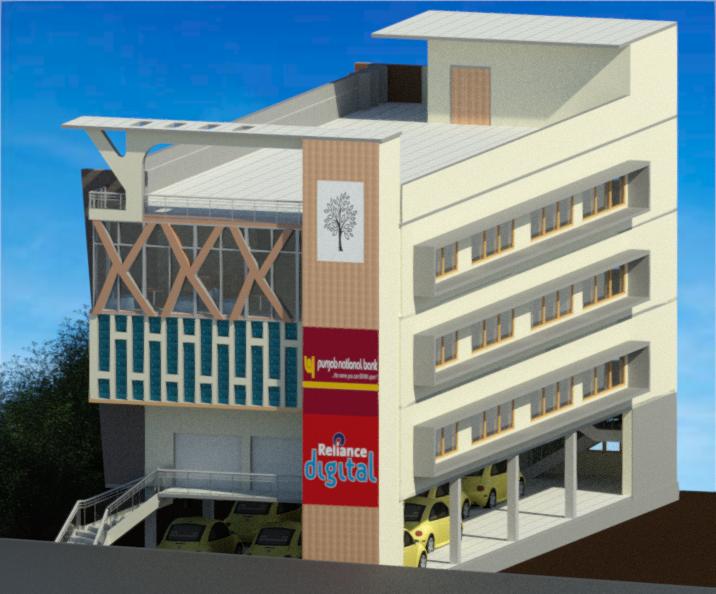 render a realistic 3d exterior view of a g 2 commercial building with clean modern geometry ground floor with glass shopfronts and signage band first and second floors for office showroom use with large windows and simple sunshades use glass acp panels textured stone and neutral colors white grey beige daytime lighting soft shadows clear sky add footpath parked cars and a few people for scale eye level or slight low angle camera photorealistic professional output