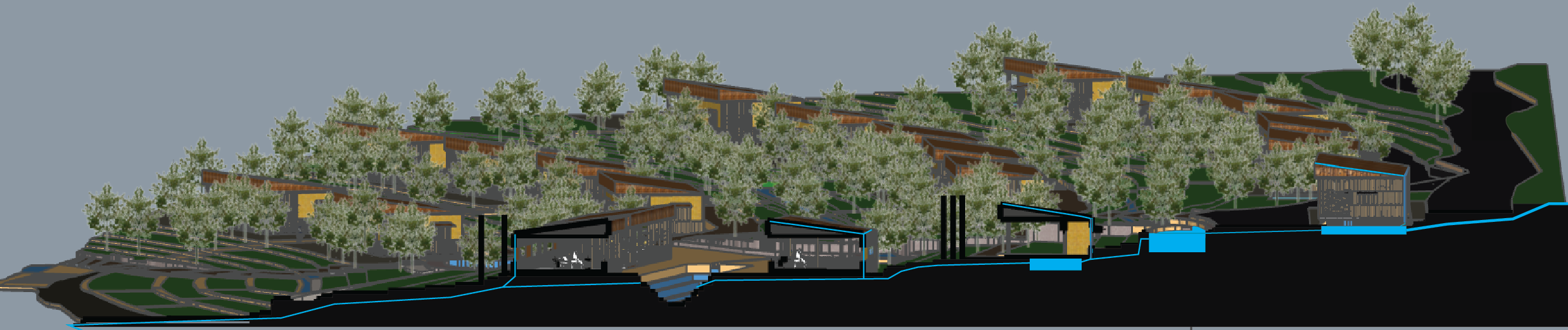 show site section cut with minimal look bule lines are water channel and water pond the images about how the water are collect and restore for dry season the image is showing terrain and contoure lines as well