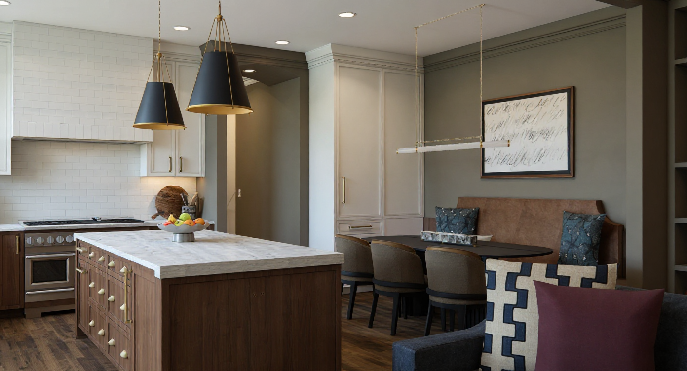 top down realistic architectural floor plan render fully textured materials wood flooring polished concrete and ceramic tiles detailed interior walls with light finishes fully furnished modern furniture layout natural lighting through large windows soft realistic shadows indoor plants fully equipped kitchen and bathrooms contemporary style ultra high resolution 4k photorealistic render professional architectural visualization warm ambient lighting