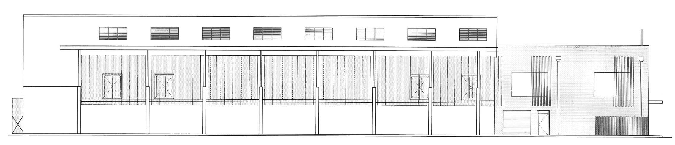 black and tan face brick to two storey office component off white and light sand colour walls copper screens to balcony white columns under building charcoal window frames blue tint glass light blue sky background architecture