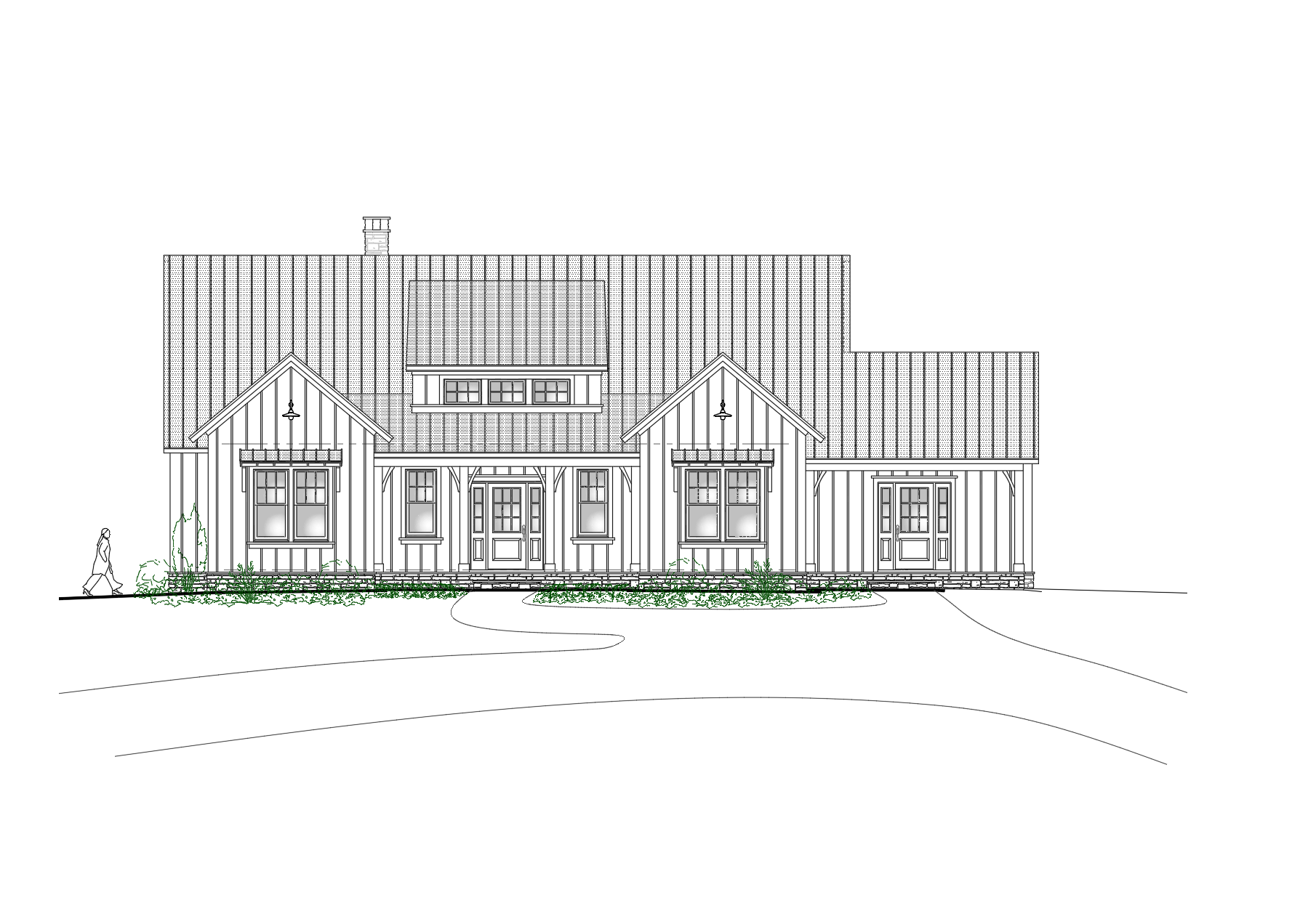 a charming farmhouse with a modern twist featuring a classic white exterior with dark gray trim the metal standing seam roof is a sleek charcoal color large windows allow natural light to flood the interior a welcoming wooden front door in a rich walnut shade adds warmth the garage doors are painted in a light gray to complement the overall aesthetic the atmosphere is cozy and inviting set in a serene rural landscape with lush greenery and a clear blue sky