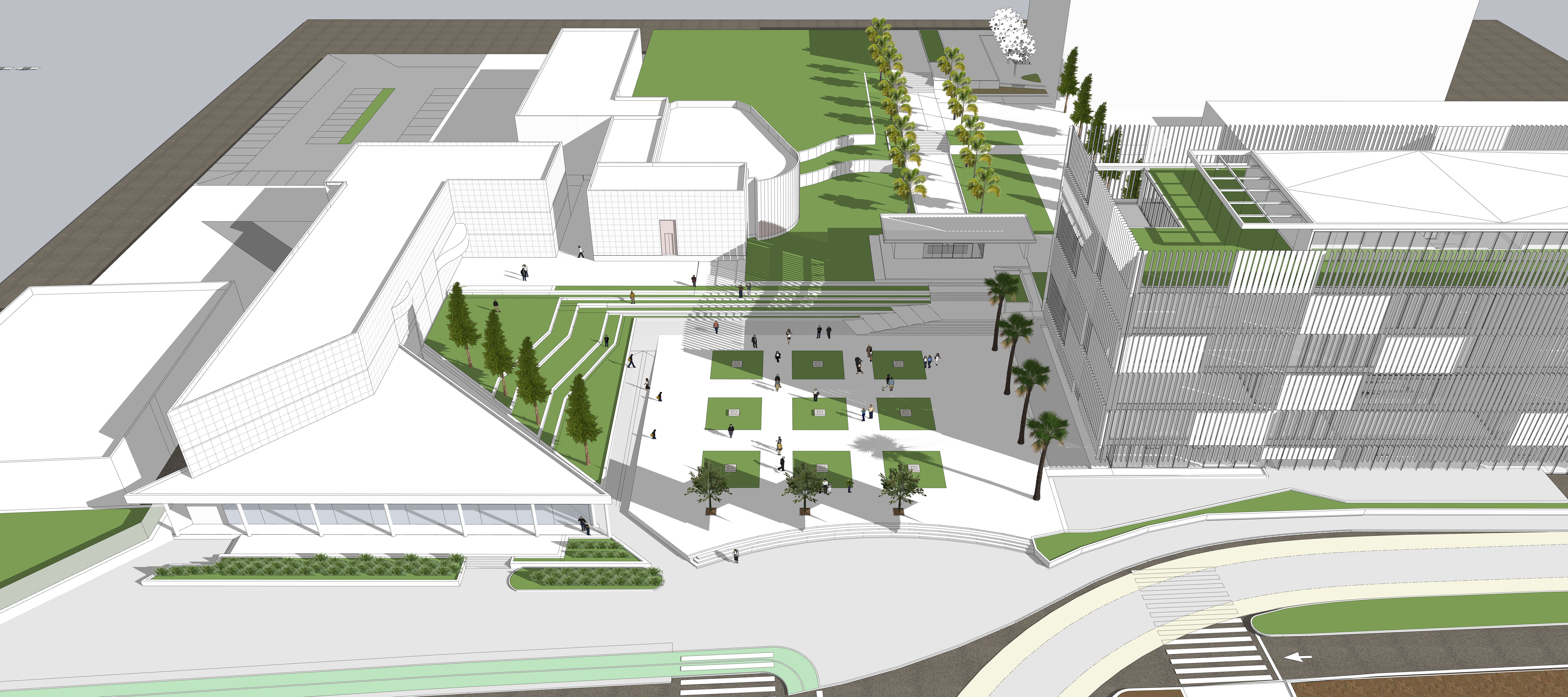 modernist aerial shot photorealistic architectural rendering based on the attached sketchup view maintain the geometry proportions and camera angle exactly as they appear in sketchup replace the unrendered textures with high quality realistic textures wood concrete wall paint glass reflections metals and so on add accurate natural and physical lighting soft shadows global illumination and high quality material rendering do not change any design elements only enhance for a very high level of realistic and clean detail architecture