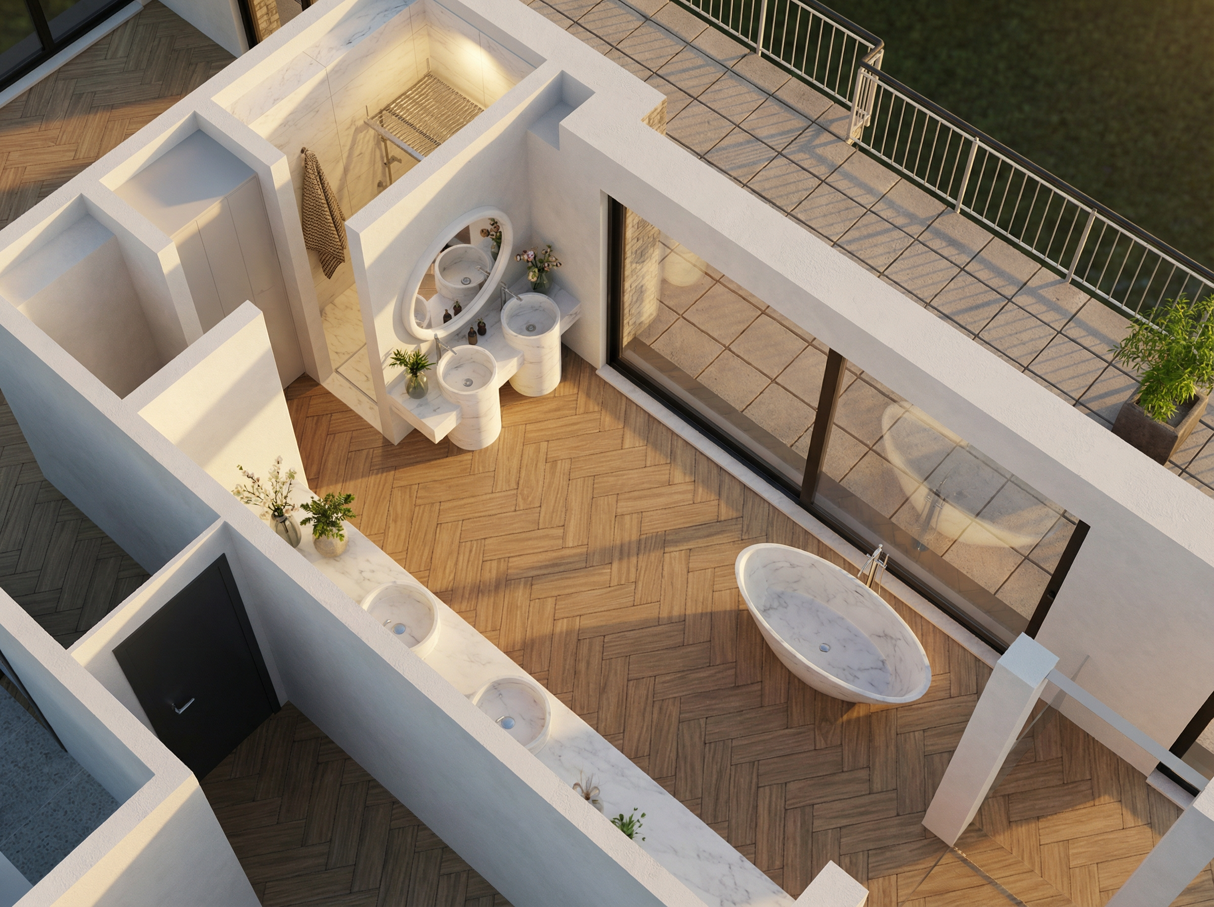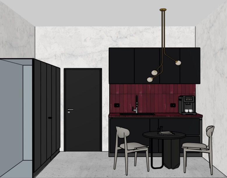 create a modern kitchen interior with a sleek minimalist design the cabinets and door are a deep antracyt color while the backsplash features a deep burgundy color the walls are textured with subtle white marble for a touch of elegance the floor is a smooth light gray concrete enhancing the room s contemporary feel include a unique pendant light fixture in brass with warm glowing bulbs for ambient lighting the chairs are upholstered in a soft beige fabric complementing the black round table maintain a clean sophisticated atmosphere with a balance of modernity and warmth