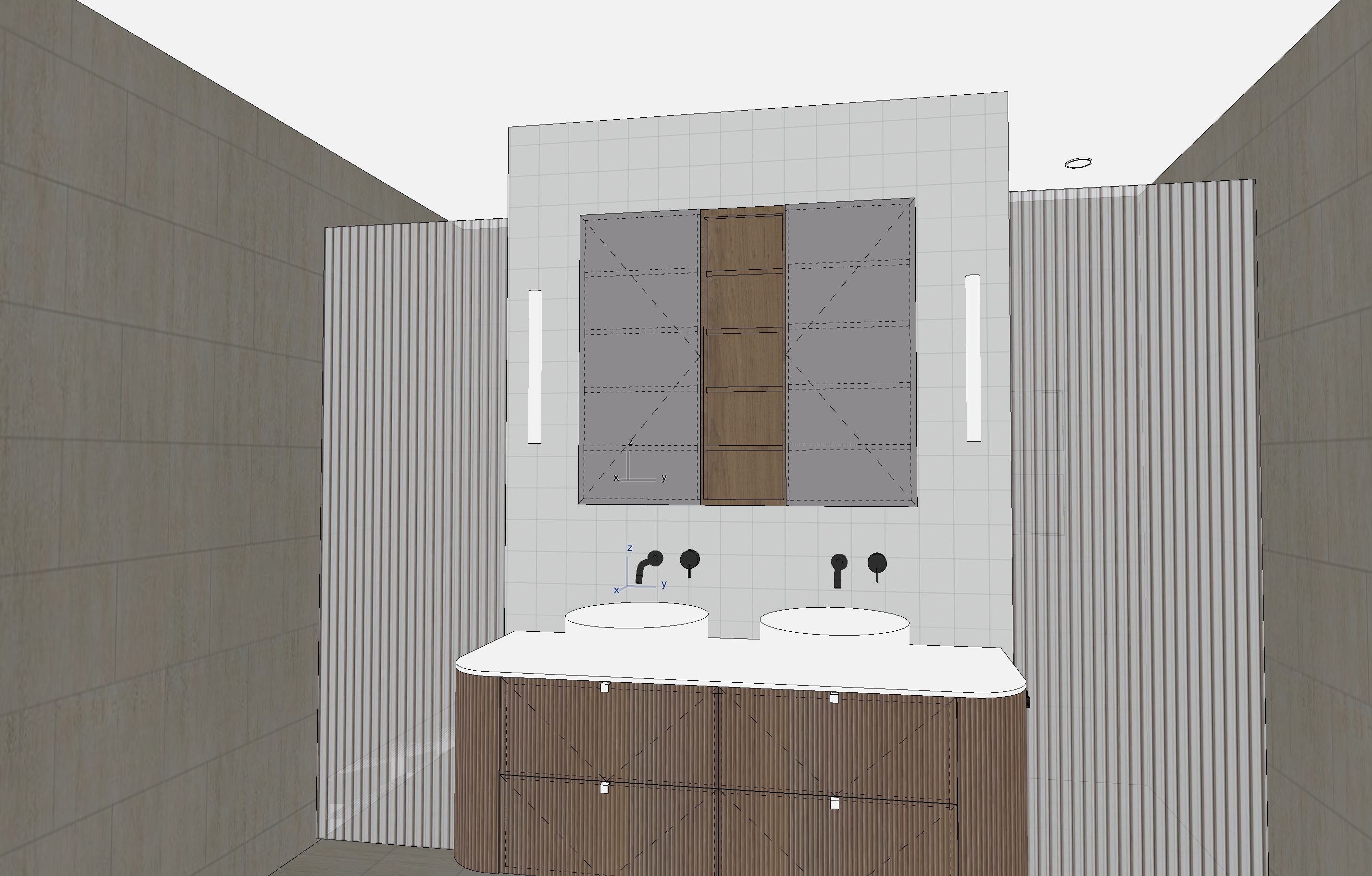 matt zellige wall tiles travertine tiles gunmetal tap fluted glass polytec coastal oak