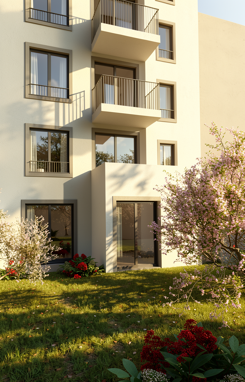 sundowner with soft shadows few clouds in the sky birds flying in front a terrace caf scene with brown wood outdoor furniture tables and chairs populated with semi transparent people sitting in front oft he building talking drinking coffee and walking by with a dog above the glass fa ade there is a rooftop caf with outdoorseating with brown wood outdoor furniture tables and chairs populated with semi transparent people sitting include a glass railing around a planted tree existing tree preserved realistic reflections and light modern minimalist architecture featuring clean lines and open spaces style scandinavian minimalism clean geometry high realism soft warm lighting color oft he lightning warm yellow beige camera eye level from the front facade made of sand limestone slabs format 120cm wide and 60cm high windows made of oak terrace floor made of sand limestone slabs format 120cm wide and 60cm long flat roof with a copper plate cover on the edge of the roof the glasfacade made of oak window frames in the background are some small family houses with trees in the upper left corner a tree should look in on the right side there is a path along the building with trees a littel bit more sun