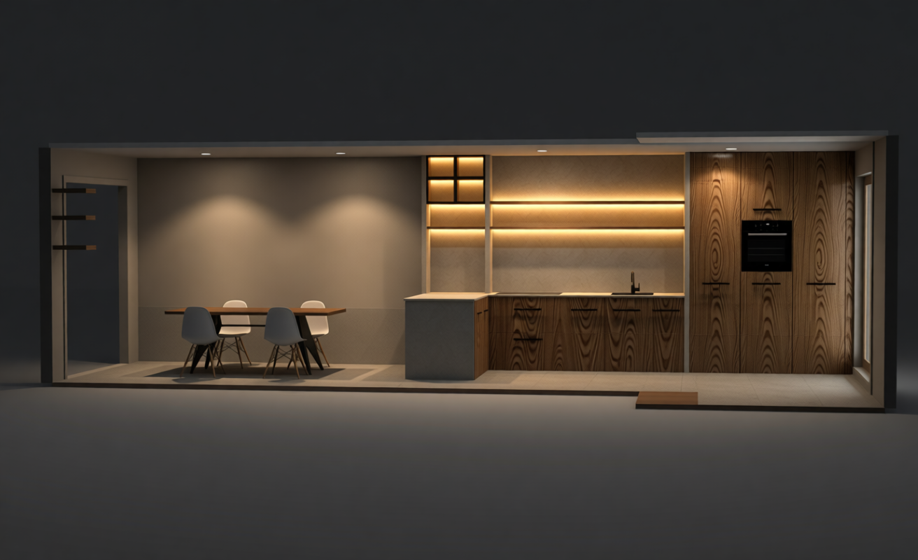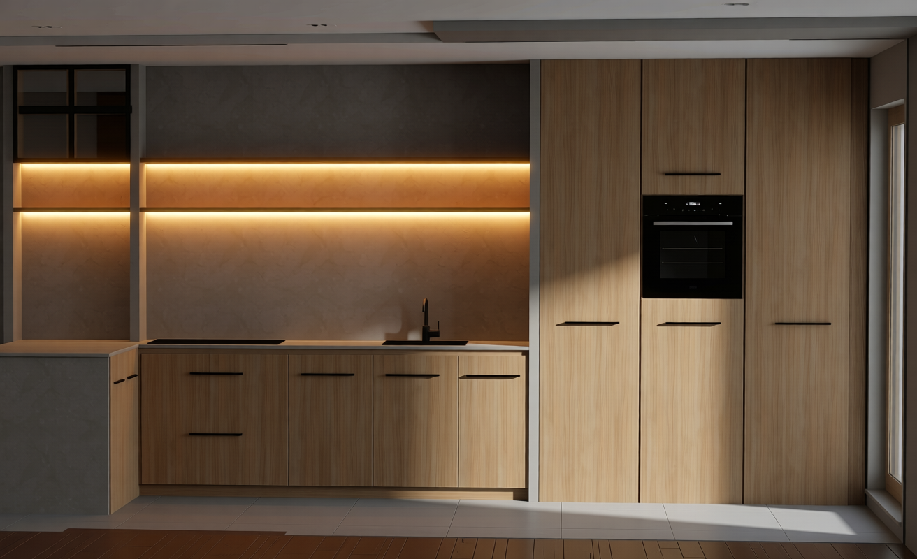 i want led beneath the shelves and make te lighting a bit more moody to create a sense of luxury the back wall counter top is grey beige micro cement or mortex all the white cabinets should be would