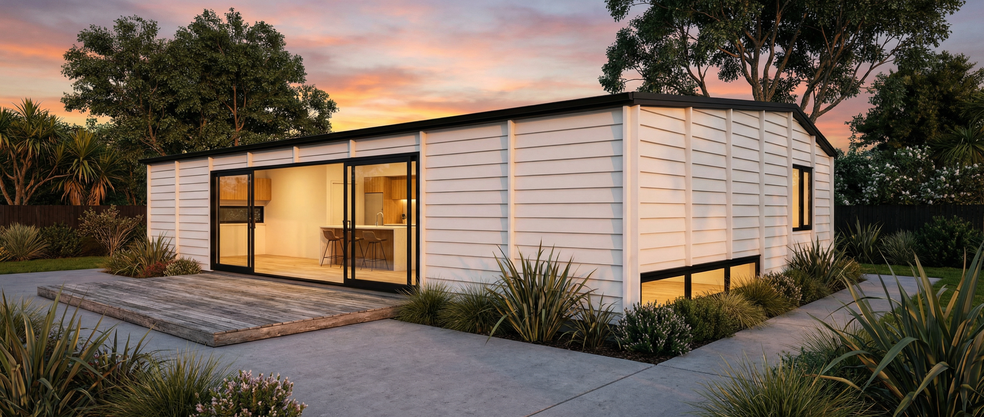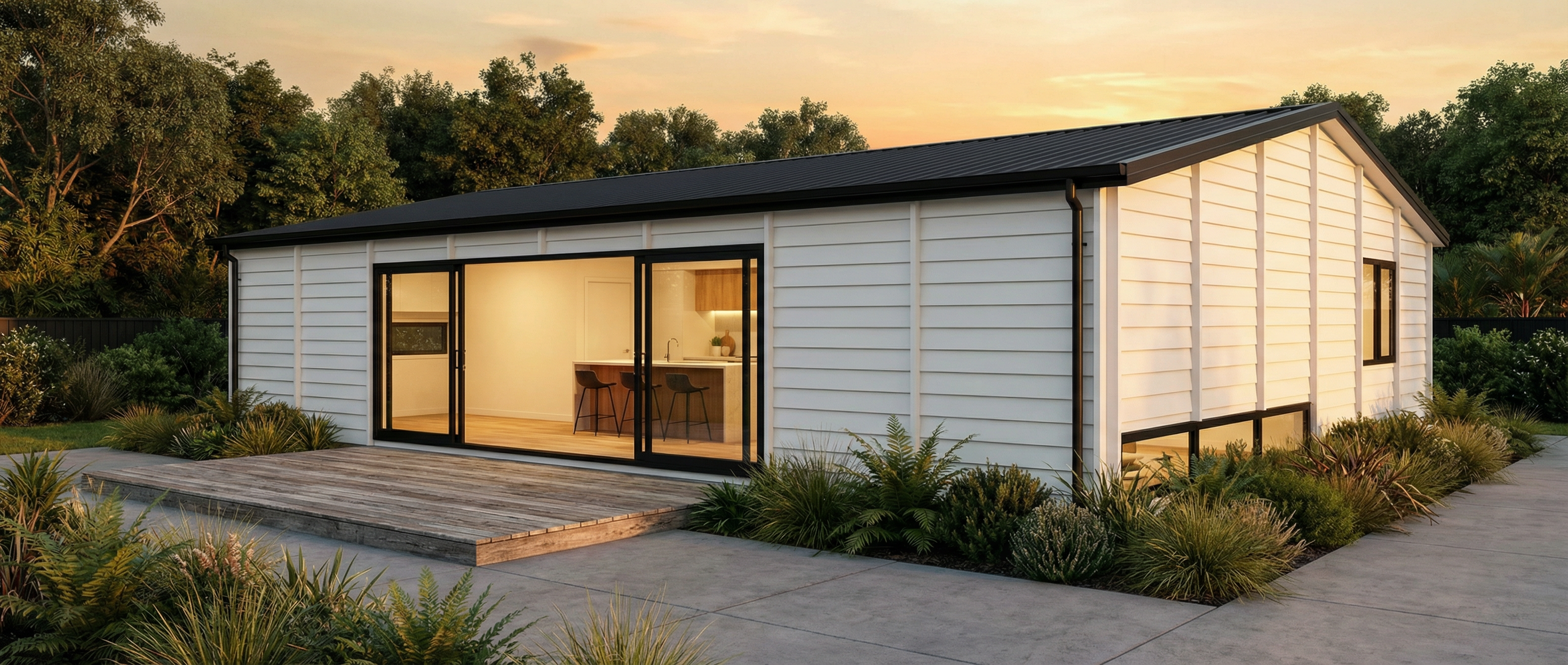 black roof white weatherboard cladding black window frames dining table inside interior lights on low timber deck trees in background extensive native planting sunset