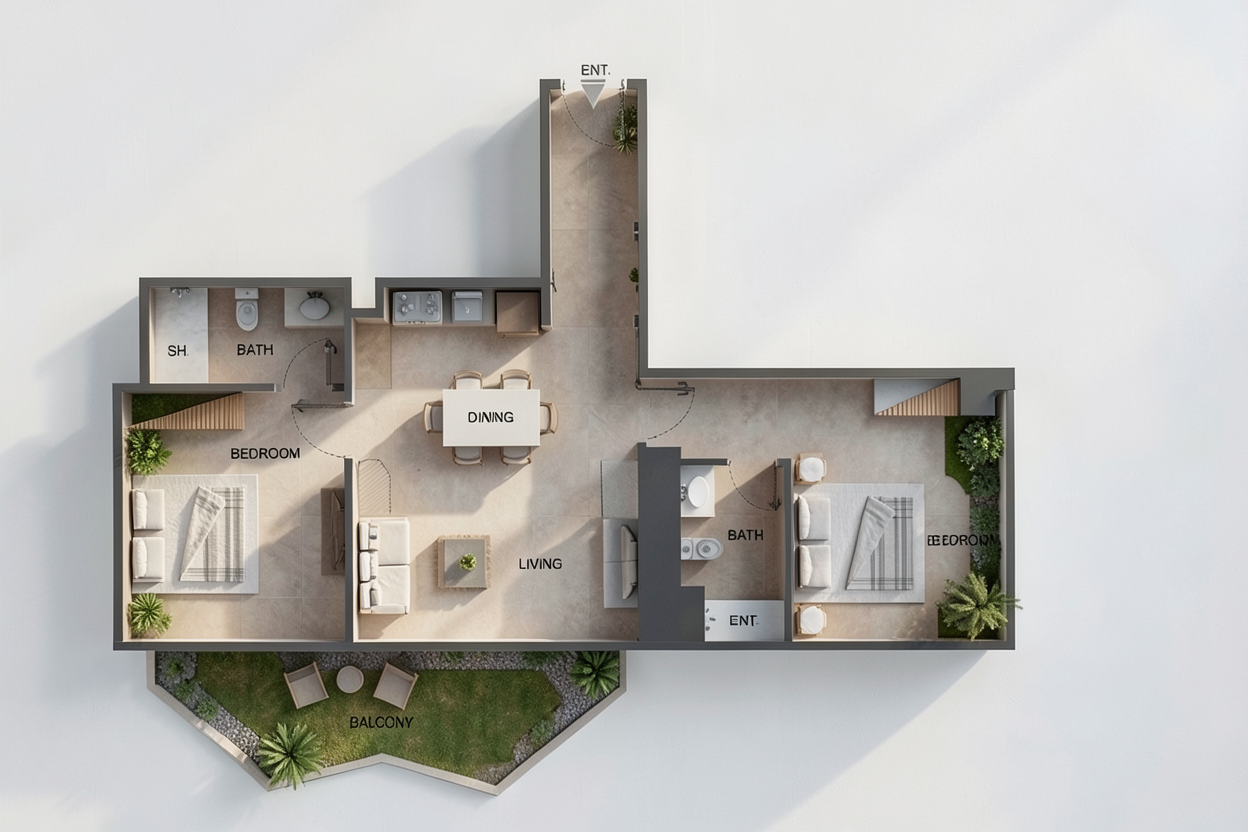 remoce the plants from the bedroom add herringbone wooden floor to all the rooms but the balcony