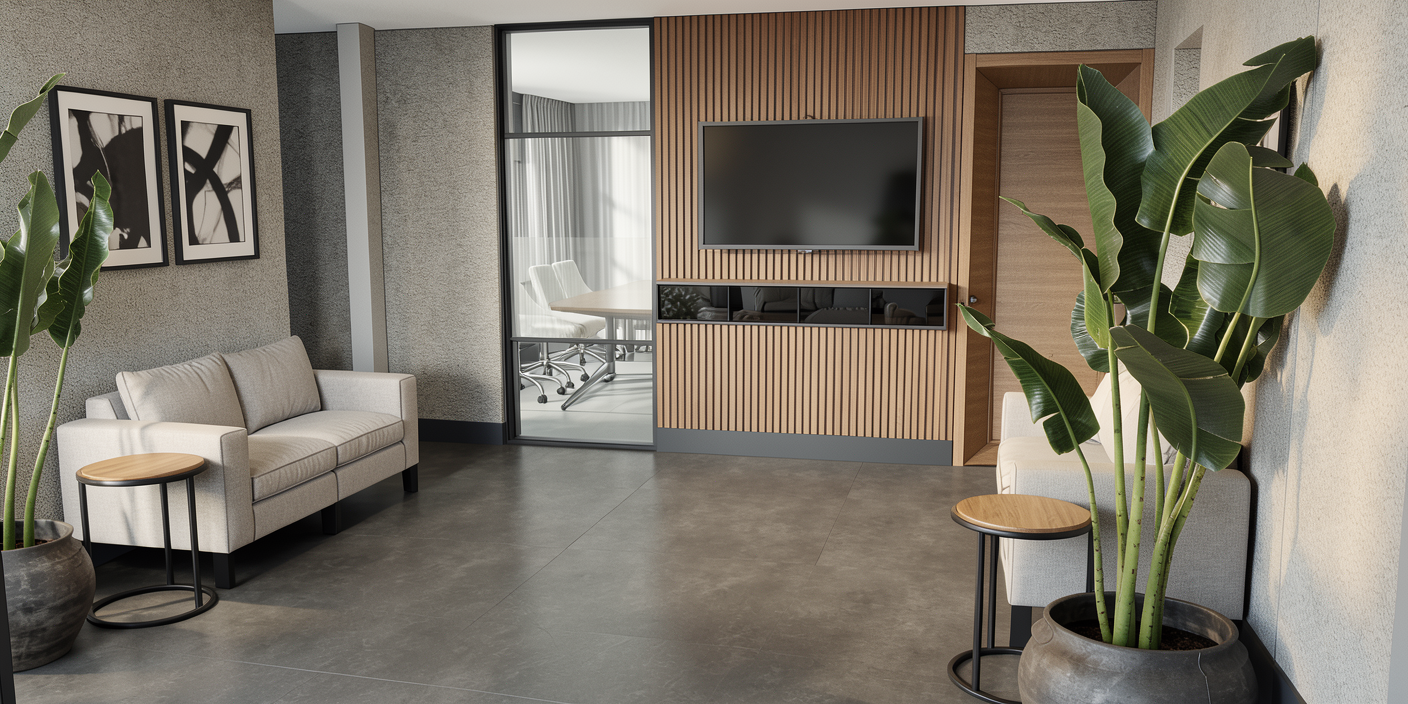 remove entrance mat remove pendant light make wood slats ash colour make all finishes matte add dark grey skirting make unit under tv matte make tv frame black
