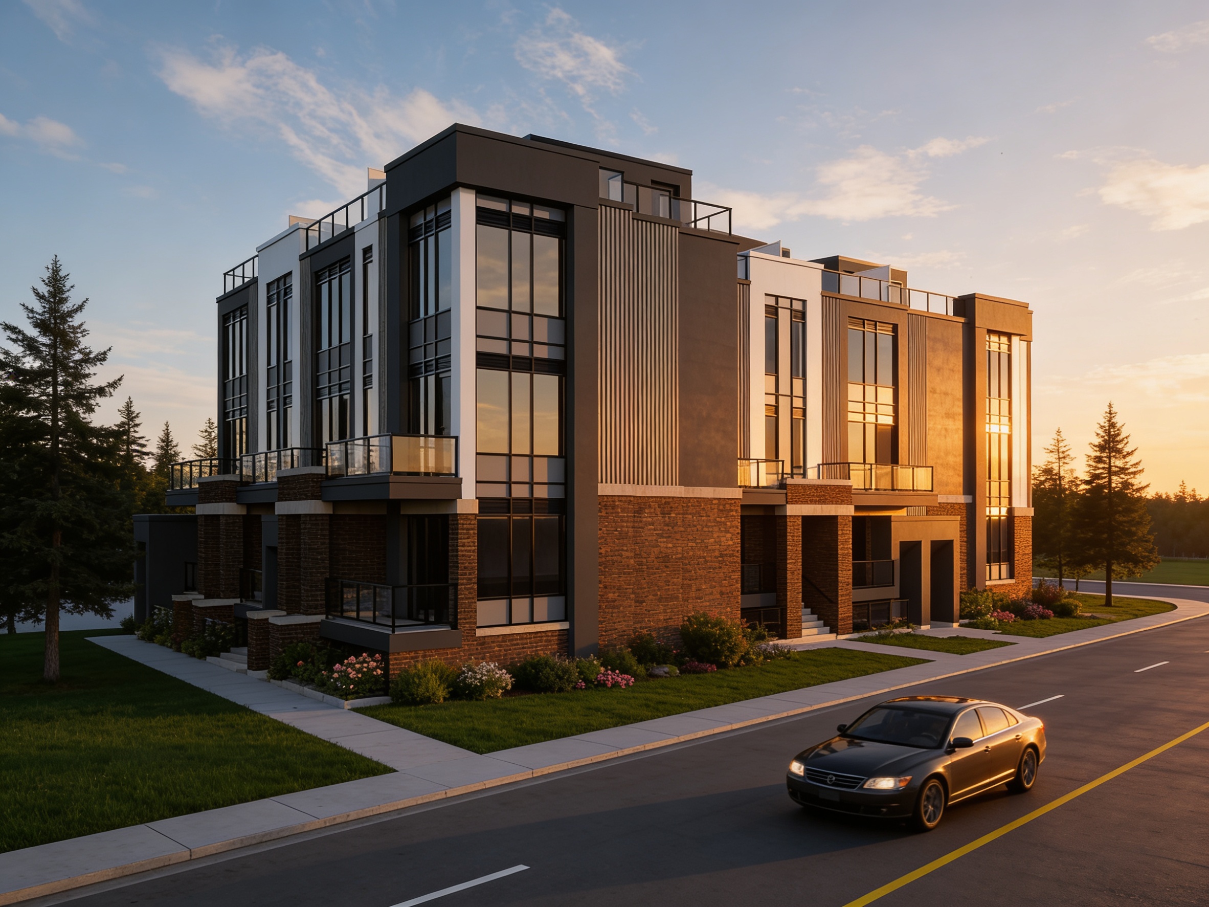 important preserve the existing geometry and the existing context exactly as provided do not modify alter reinterpret add remove scale or reshape any geometry do not change the site surroundings street layout neighboring buildings vegetation or context elements do not modify geometry scale proportions buildings road layout sidewalks or surrounding context in any way keep the road marks facade materials light beige warm grey concrete and plaster subtle texture high material realism emphasize facade depth through existing balconies and window recesses using light and shadow only warm interior lighting visible through windows soft and natural neutral exterior lighting early evening blue hour atmosphere soft sky realistic light falloff photorealistic architectural rendering clean and balanced contrast calm cinematic mood style contemporary european residential architecture minimalist premium understated