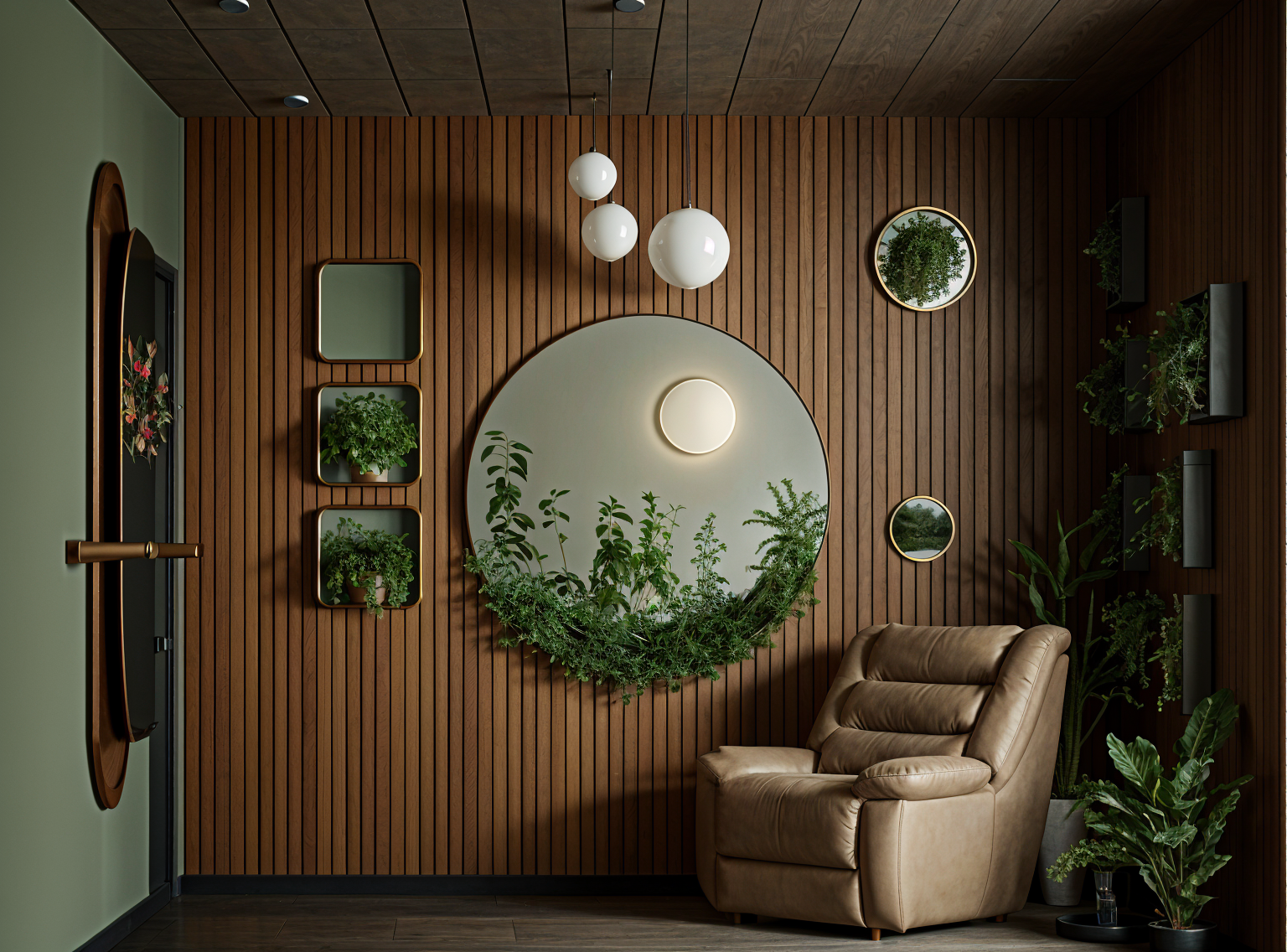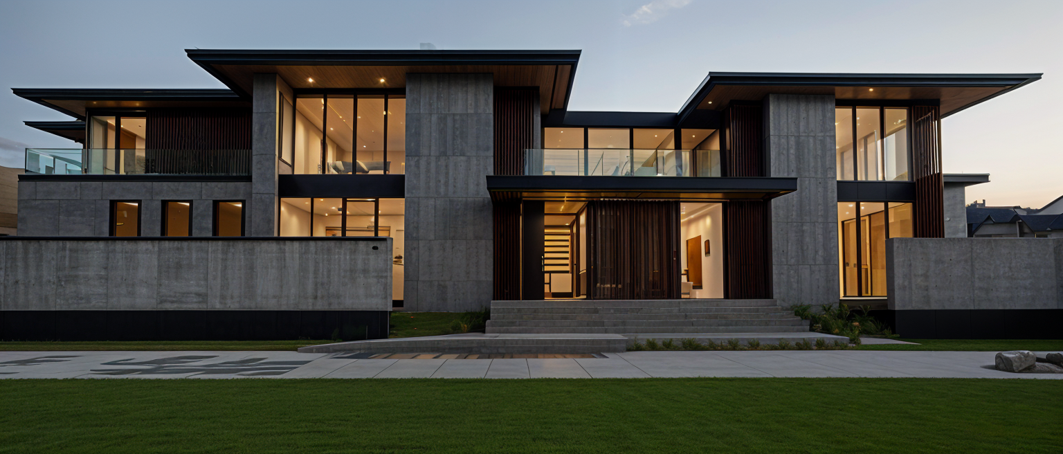 create a realistic rendering of a modern single story house the exterior walls are painted white hardie board complemented by a dark gray roof windows are framed with white trim is white garage door is sherwin williams taupe tone the front door is wooden with a rich warm brown stain include soft warm lighting emanating from the porch lights surround the house with a mix of dry scape with rock beds and lush green grass and add a few colorful flower beds with vibrant reds yellows and purples the atmosphere is serene and inviting capturing a sunny day with a clear blue sky architecture