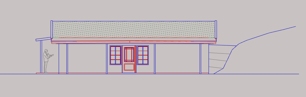 roof with grass on top front of roof in grey green colour window and door in ockra yellow facade in sand coloured plaster 4 pillars in front in grey green colour
