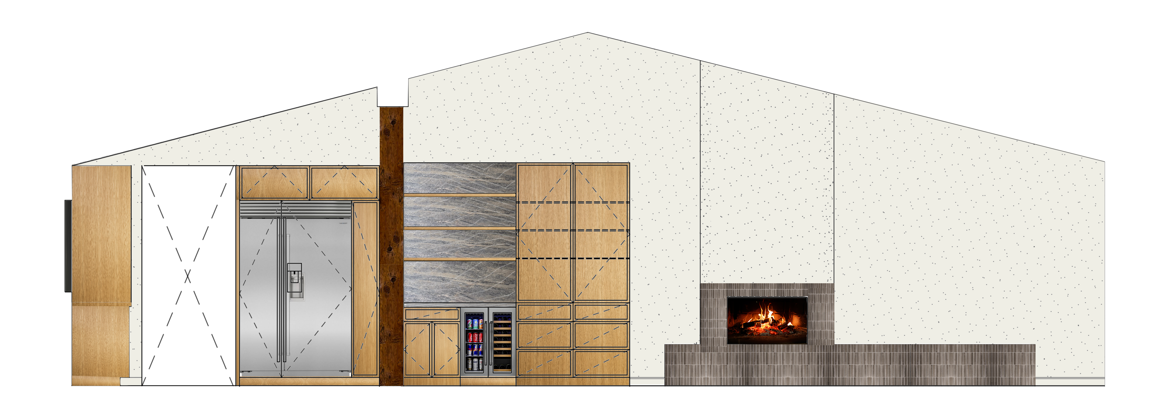 make this interior elevation look realistic cabinet color is a light wood tile partially up fire place and on hearth is daltile remedy zen fluted