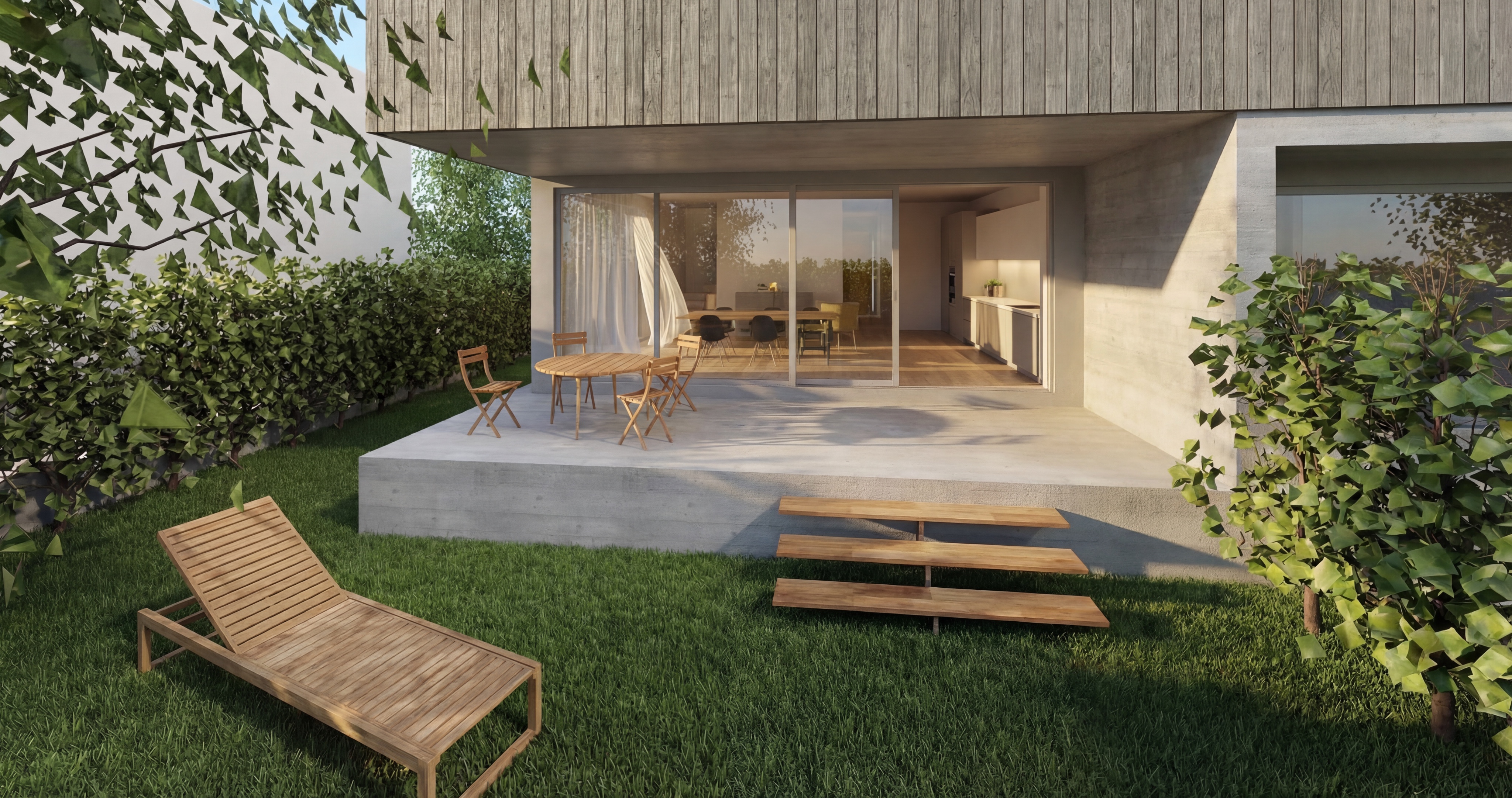 ajoute des voilages a l int rieur uniquement dans l angle des fenetres a gauche ajoute une nape et des assiette une bouteille et des service et verre sur la table ronde ajoute une d coration en bois design de taille moyenne au centre du mur droite de la terrasse dans le prolongement de la haie remplace les feuilles de la haies a gauche et droite de l image par des plus petites feuilles ajoute trois spots encastr s au plafond de la terrasse ajoute des branche pour relier les feuilles de l arbre situ en haut et gauche de l image ajoute un petit pot avec des herbes haromatique dans l angle gauche de la terrasse ajoute un linge de bain color et un livre sur la chaise longue ajoute une petite femme assise sur les marches qui regarde son fils et sa fille qui jouent avec un golden retriver ajoute un homme qui sort de la cuisine et qui apporte deux verres de vin change la couleur des lames en haut de l image en gris vert fon ajoute un salon d exterieur avec un canap contre le mur droit de la terrasse une table basse et deux fauteuils remplace les feuilles de la haies droite de l image par des plus petites feuilles et plus dense change la couleur des cadre de fen tres en bronze fon