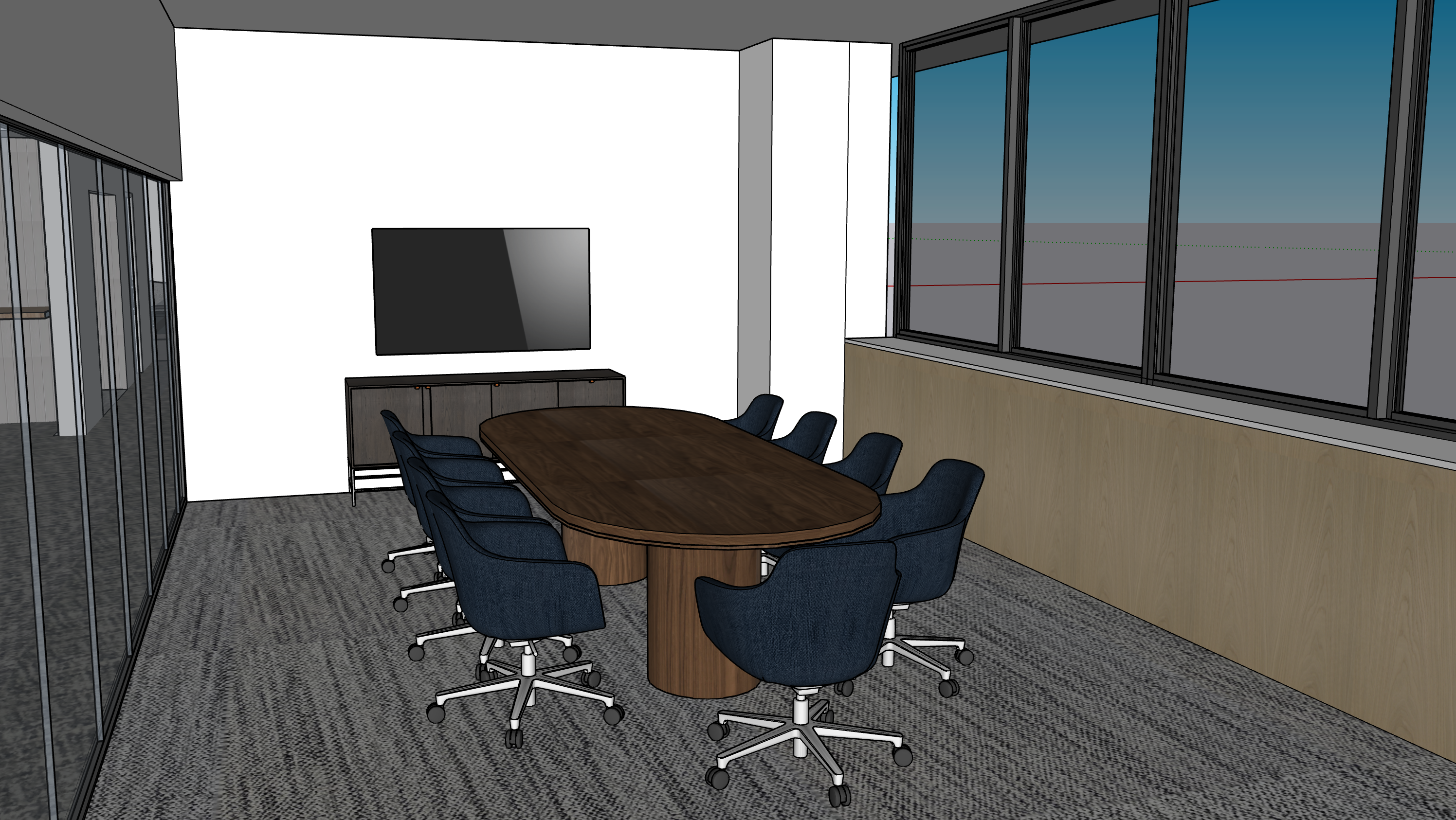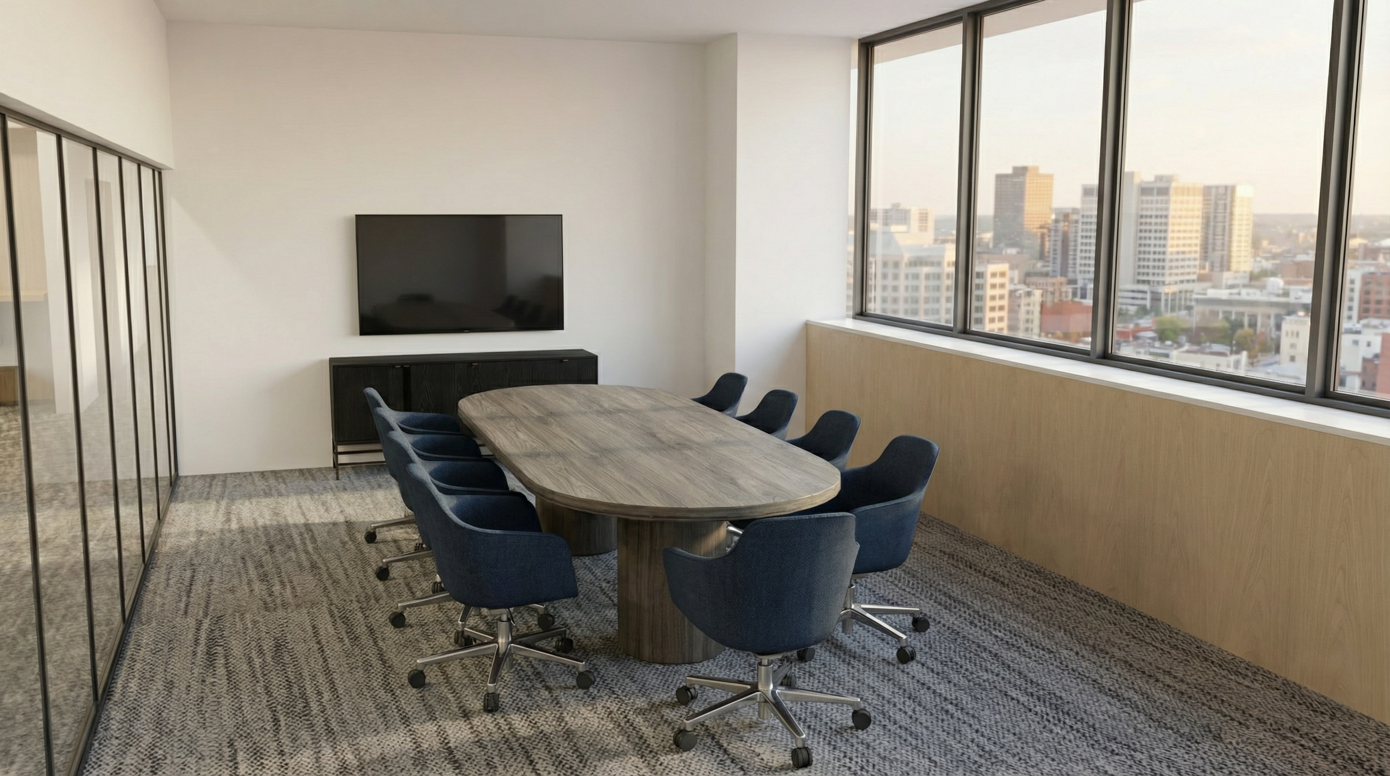 please make the lighting soft even warm and bright keep material as they are shown in the image add city buildings views in the window the console is charcoal gray wood and conference table is a gray toned wood