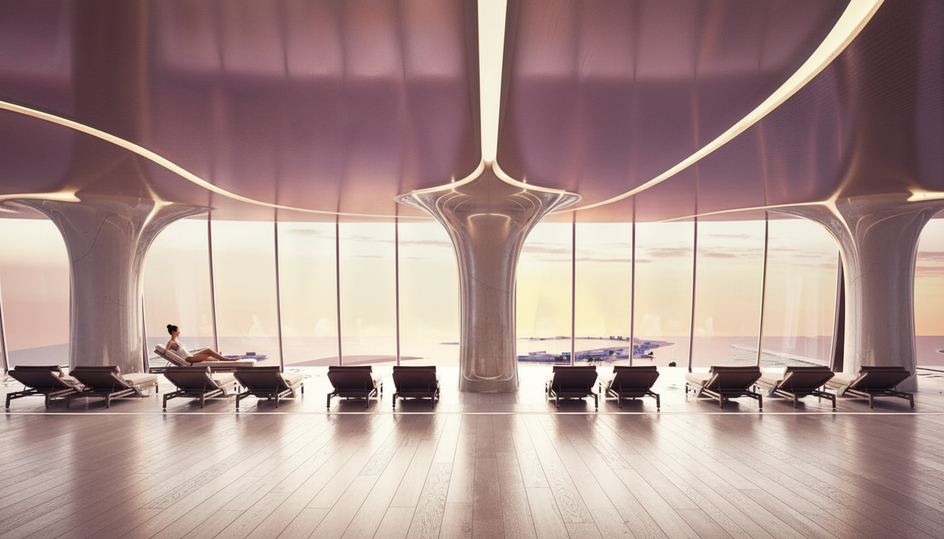 day time interior sky pool render with luxurious loungers lighter scandinavian white timber on floor make the ceiling double height and pool much bigger expanding pool up to the glass line without changing the architecture show a model lying the lounger the scene should exude luxury a jade coloured pool in the foreground from end to end adding a sense of luxury i want the line of sunloungers closer to the base and the pool to move up to the glass