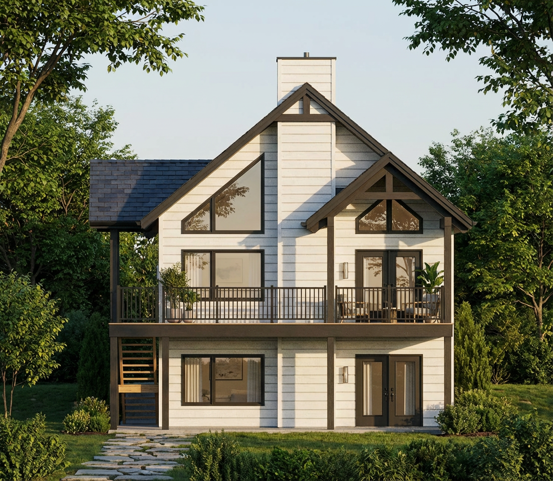 add decorations add vegetation add trees make it realistic under left side deck pathway to enter