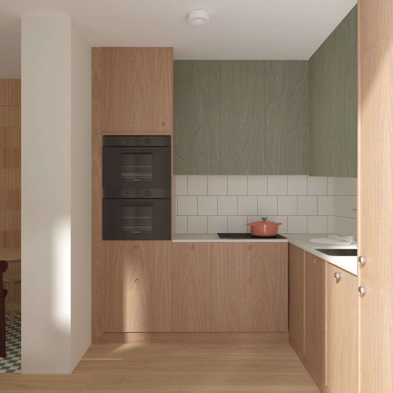 enhance the realism of this architectural visualization without changing any materials colors textures finishes furniture layout proportions or design elements keep all existing materials and color tones exactly as they are improve photorealism by refining natural lighting global illumination soft shadows subtle reflections accurate light bounce and realistic exposure add physically accurate light behavior micro contrast depth and subtle imperfections very delicate surface irregularities fine texture detail while preserving the original look improve realism through physically correct daylight simulation soft contact shadows realistic ambient occlusion subtle material roughness refinement without altering material type or color enhanced depth of field very subtle natural cinematic but natural color grading no color shift high dynamic range lighting do not redesign restyle recolor replace materials or modify objects maintain the exact same design only increase realism and photographic quality output should look like a professional architectural photograph ultra realistic natural balanced high end visualization kitchen cabinet fronts feature a milled integrated round handle detail the handle is carved directly into the front panel as a circular recessed grip maintain the same material and color as the cabinet fronts do not change finish or tone