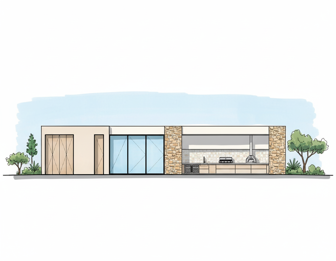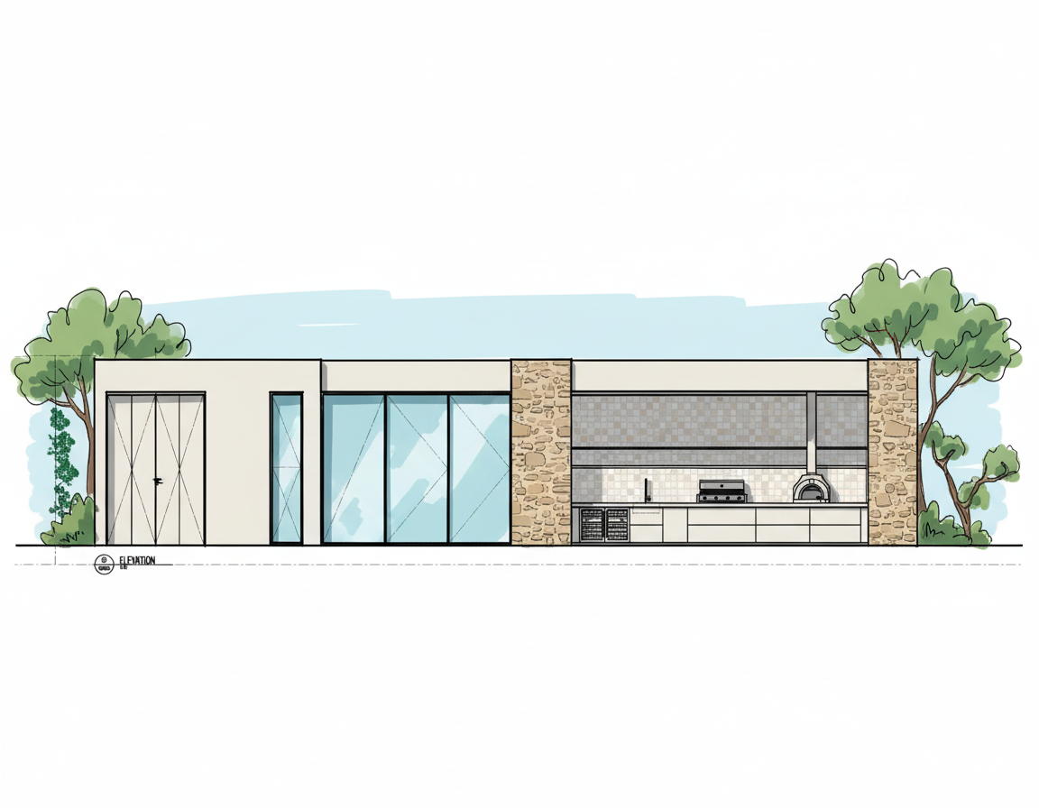 architectural hand sketch rendering of a modern mediterranean l shaped poolhouse with flat rendered roofs and stone accents drawn in the style of an architect s sketch use calm neutral render coloured render black window frames and rendered coloured hinged doors on left side outdoor kitchen is open on the righthand side and set back 8 metres from the inside section on the left show strong contrast and bold color blocking light off white panel areas and warm natural stone accent walls windows should have black frames and cool blue reflections render expressive freehand linework with visible marker streaks and layering emphasizing depth and tone single door on right to be rendered include foreground australian small native trees and plants on left and background native trees and plants on the right with green foliage loose shadows and a soft blue sky wash behind splashback of outdoor kitchen should be travertine square small tiles the overall composition should feel refined balanced and artistic like a presentation board sketch style tags architectural marker sketch hand drawn rendering refined style modern mediteranian pool house charcoal contrast presentation board illustration architecture