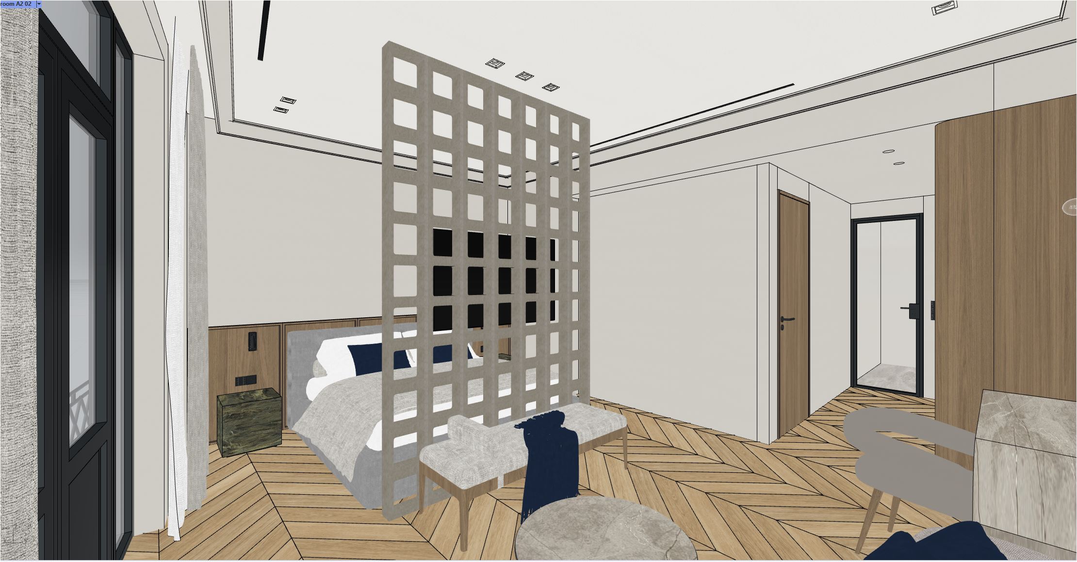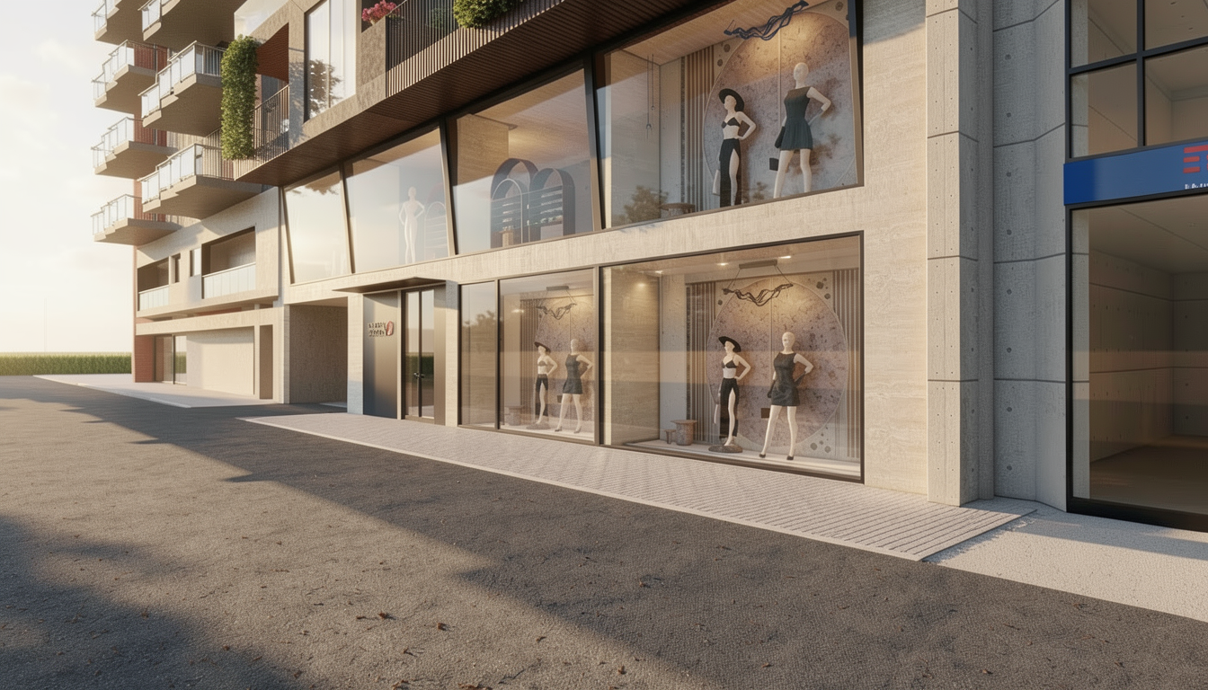 create a realistic high resollution materials image switch on lights do not redesign the geometries or styles physical light inserts from outdoor midday daylight at the end of corridor there is a black metal glass door