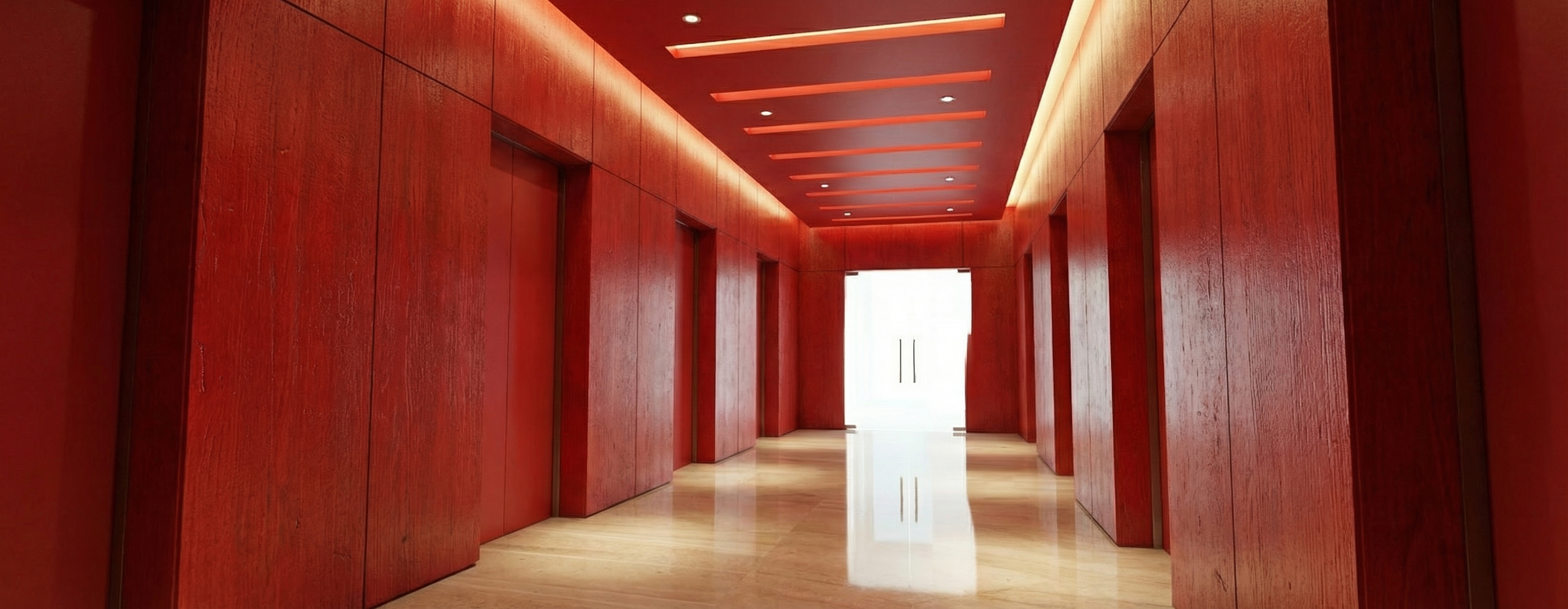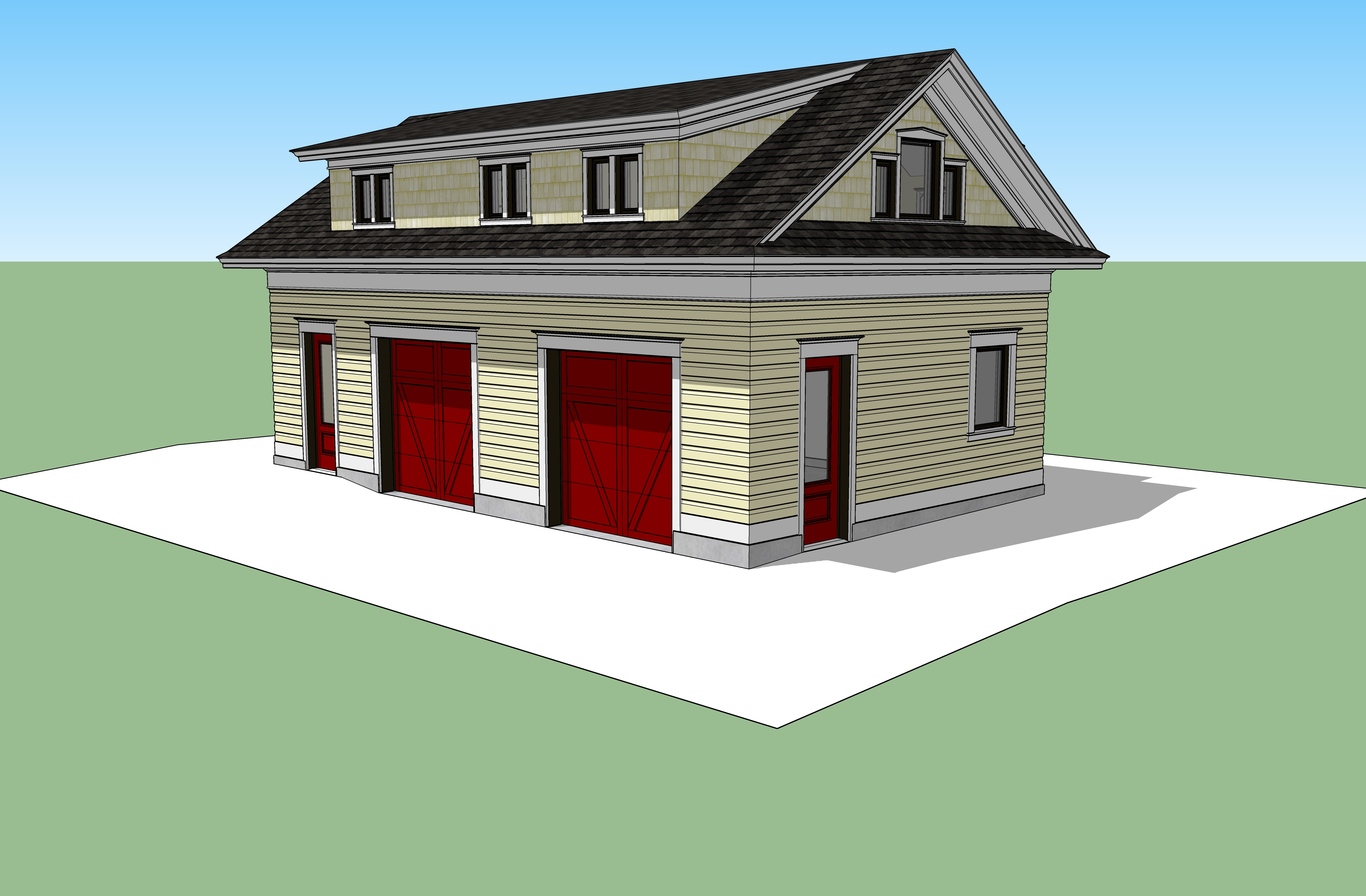 set this in an urban backyard setting with a japanese style garden with a koi pond to the left of the building driveway in front of the building headed to the right off screen tall maple trees behind the building then a japanese inspired fence then an apartment complex behind the fence pleasant early summer late afternoon glow with sun source from the left japanese maple tree in planter between garage doors and another one to the left of the far left garage door between the garage door and the man door japanese maples need to be tall enough to be out of the path of moving cars and provide pleasant dappled shade