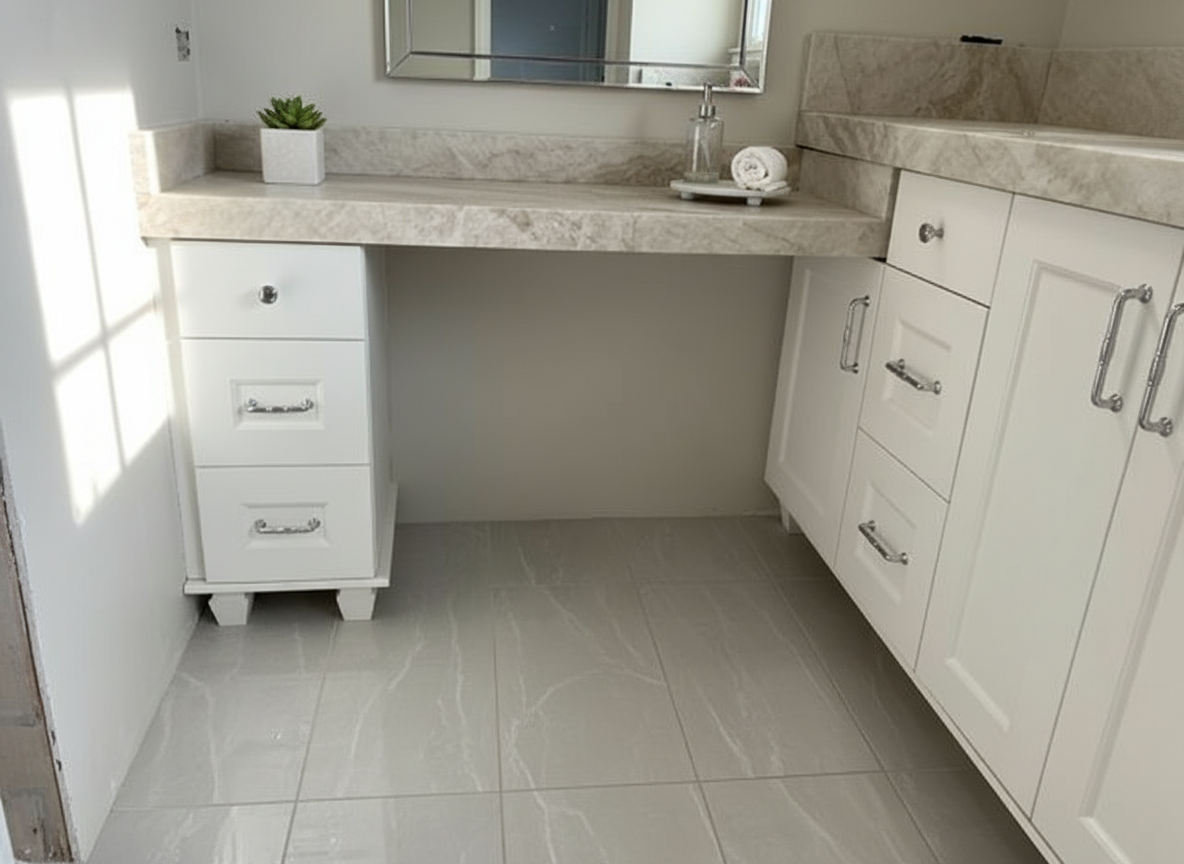 adjust for natural lighting remove everything on the floor add new flooring stage the countertop stage the items on the glass shelves in the cabinets
