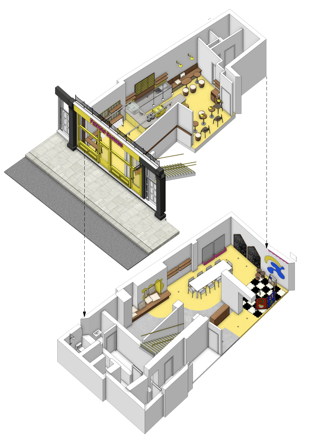 exterior shot conceptual isometrical drawing for a coffee shop showing two levels with pop colours and playful furniture for children architecture