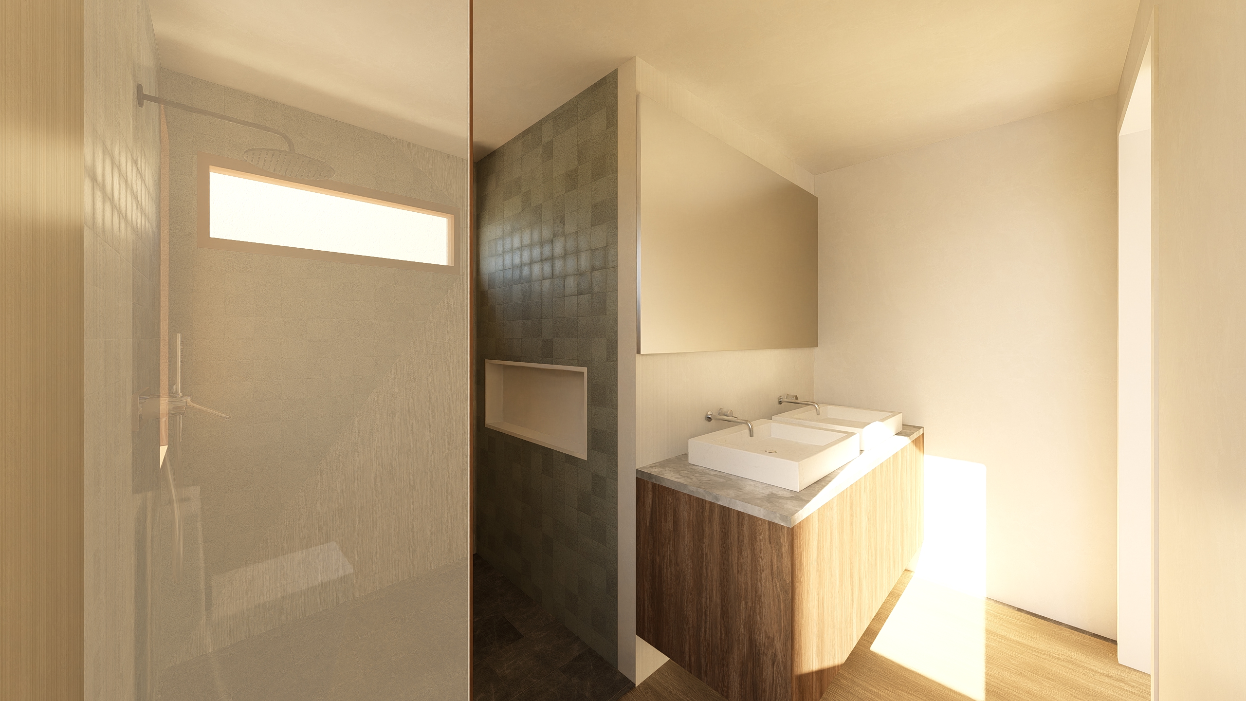 ultra realistic mediterranean contemporary bathroom inspired by modern mediterranean architecture camera fixed exactly like reference image same angle focus and composition no objects moved or resized no changes to layout or geometry walls finished in smooth lime plaster with warm white and beige tones subtle hand applied imperfections matte microtexture visible under soft ambient light shower area with hexagonal terracotta floor tiles matte finish natural texture slightly irregular edges warm earthy color contemporary adaptation of traditional mediterranean tiles lower shower walls clad in handcrafted ceramic tiles in soft beige tones matte finish subtle bump texture showing artisanal detail floor outside shower continuous natural stone or microcement in soft beige matte fine texture uniform minimalistic design floating wooden vanity with natural light oak finish matte oil waxed texture straight contemporary lines thin horizontal slatted cabinet doors natural wood grain visible countertop in warm beige marble with soft veining polished but matte refined edges sharp and precise minimal accessories folded linen towels in neutral tones small matte ceramic vessel on countertop soap dish in matte ceramic toothbrush and hairbrush in natural wood or ceramic wall mounted towel rails with matching towels small framed artwork with subtle mediterranean motif shower niche alcove hornacina contains neatly arranged shower items shampoo and conditioner bottles soap body brushes all in natural or matte ceramic neutral tones the niche and the mirror are softly backlit with warm led light highlighting the objects and textures subtly lighting soft natural daylight from window warm ambient led behind mirror and under vanity highlighting textures and materials subtly overall composition clean minimalistic airy contemporary mediterranean elegance warm soft tactile inviting calm atmosphere render with ultra realistic lighting physically accurate materials detailed micro surfaces shadows and reflections