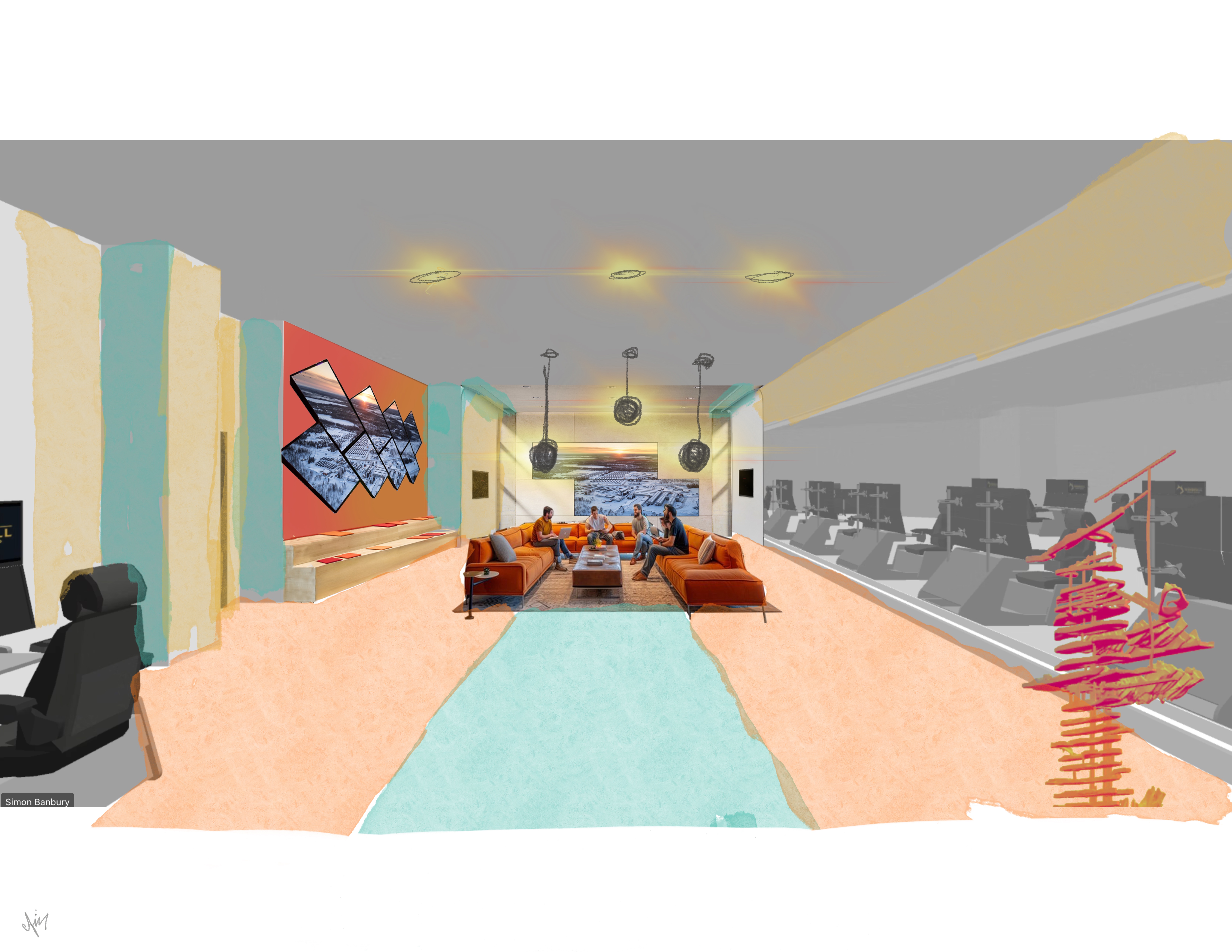 interior shot an indoors shot of a visitor s center a bench for group presentations against the left wall with video screens on th wakl above it a lounge area in the middle and a sculpture on the right side of the room the right side of the room is a control room behind a glass window so that visitor can see the operators in action the floor pattern marks a path visitors should follow