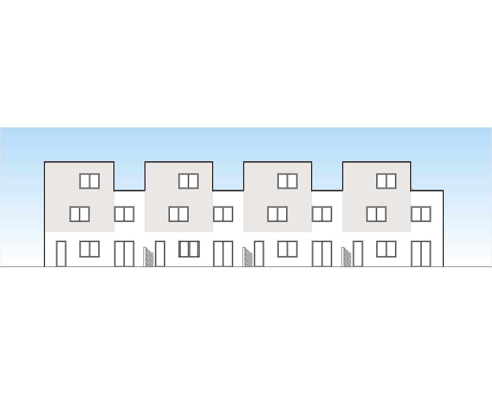 sunny vibe with clouds add trees on the sides no flowers white and grey smooth facade like in image bright grey window frames lawn in front use exact building like it is in the image