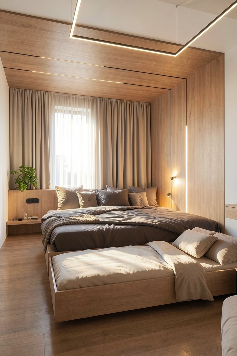 keep the curtains and the couch put grey hanging curtains on the outer sides os windows put a huge built in cabinet on the back wall behond the couch give some light to open shelves open shelves sohuold be in the middle of the cabinet make it look modern a want wooden things to have a dark walnut shade i want the walls and ceiling to have beige color like the couch the round rug should have one color i need ceiling moulding