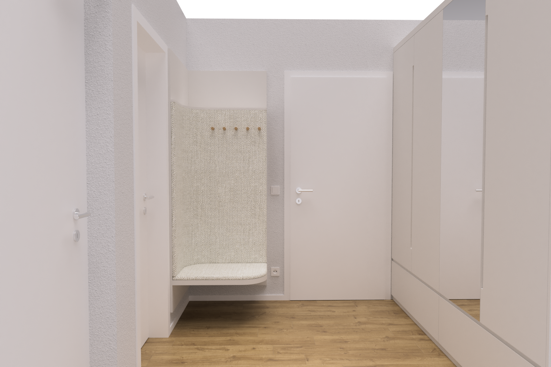 improve the realism of the provided interior render while strictly preserving the original composition and architectural intent strict rules must follow do not change camera framing proportions or geometrydo not add remove or redesign any elementsdo not introduce any new light sourcesdo not add led strips hidden lighting cove lighting or glowing ceilingsdo not add or show any visible light fixtures on the ceilingthe result must be based only on the provided imagematerial and color specifications walls light white plaster subtle texture matte finish floor natural oak wood flooring warm tone realistic grain and subtle imperfections bench chalk painted finish matte soft texture wall panels around the bench same chalk colorbench seat light grey upholstered fabric soft texture realistic shading wall hooks natural oak wooddoors light white matte finishdoor handles brushed stainless steellight switch light white next to the doorpower socket light white near the floorlighting very important use only artificial lightinglight must appear as if coming from ceiling downlights but no fixtures may be visible in the frameceiling must remain clean flat and without any visible luminairesdo not create glowing ceilings or visible light sourcessimulate realistic top down illumination using soft indirect diffusion from abovecreate natural light falloff and subtle gradients as if emitted from recessed sources outside the visible frametemperature neutral warm 3000 3500k shadows and realism add realistic shadows especially under the benchin cornersaround door framessubtle ambient occlusion and contact shadows requiredrendering quality enhance global illumination and indirect bounce lightadd micro imperfections and realistic material response pbr keep the scene minimal and clean no stylization or extra effectsgoal achieve a physically believable hallway render lit from above with no visible light fixtures maintaining a clean ceiling while preserving full realism and fidelity to the original image