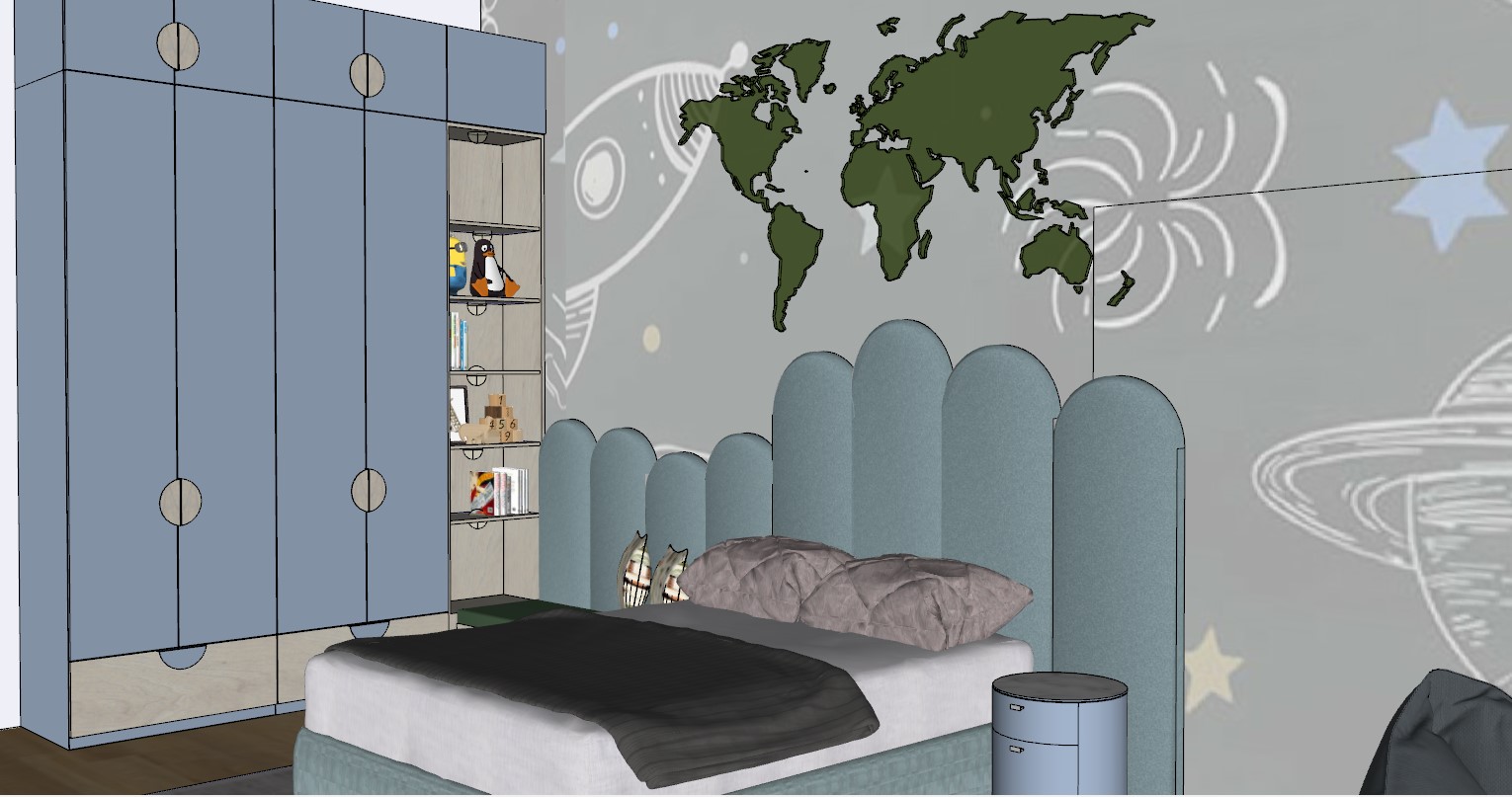 the bed is very soft dark beige closet is blue and light oak like in the sketch wallpaper same like in the sketch add some toys light and accessories also the world map on the wall is lighted plexiglass wallpaper is matt