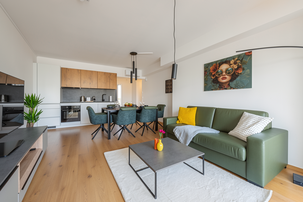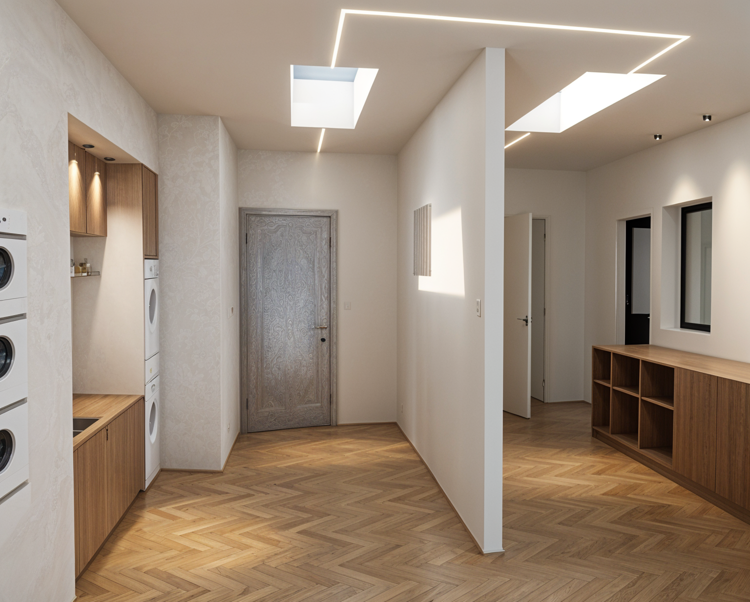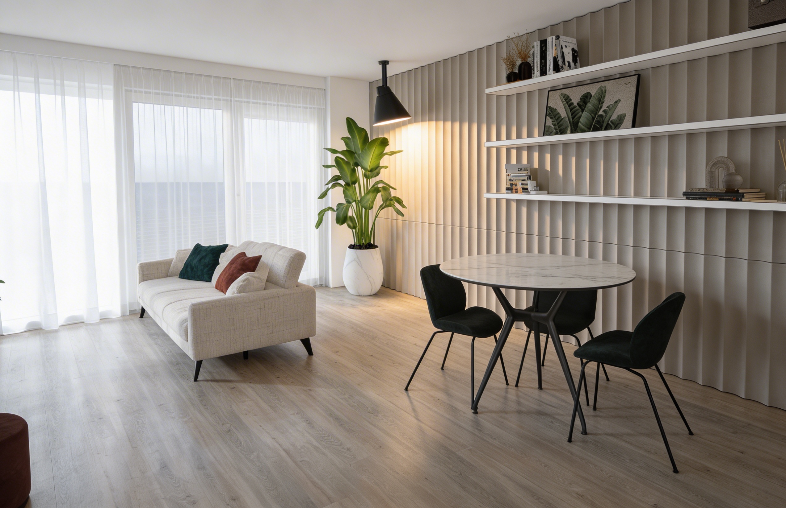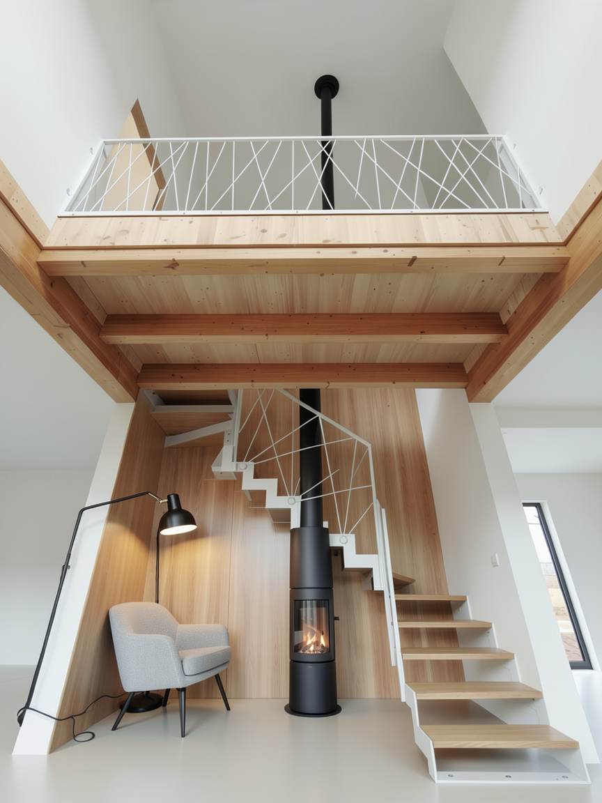 refine the existing interior render with strictly minimal controlled adjustments only preserving the current architectural concept materials and overall composition move the existing fireplace forward into the space by approximately 30 cm clearly further away from the rear part of the staircase the fireplace design proportions materials and detailing must remain completely unchanged only its position is adjusted the chimney must remain a clean uninterrupted vertical element not intersecting touching or covering any staircase elements walls ceilings or other surfaces wall cladding must remain exclusively on the rear wall only no cladding on side walls under stair walls or any other surfaces add a subtle minimal floor lamp in the left rear corner under the staircase positioned behind the lounge chair the lamp must be non jointed non adjustable visually calm and discreet with a slim silhouette and soft diffused light avoid any articulated technical or dominant lighting forms keep the lounge armchair positioned near the left wall preserving its scale orientation and comfortable lounge character preserve all existing staircase geometry railing wooden structural elements floor finish ceiling and global lighting balance the result must read as a precise spatial correction of an already resolved modern interior not a redesign restrained contemporary and coherent high realism architectural visualization quality accurate scale clean shadows neutral color balance