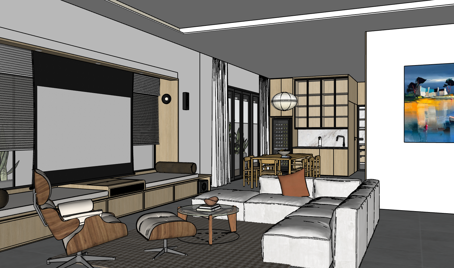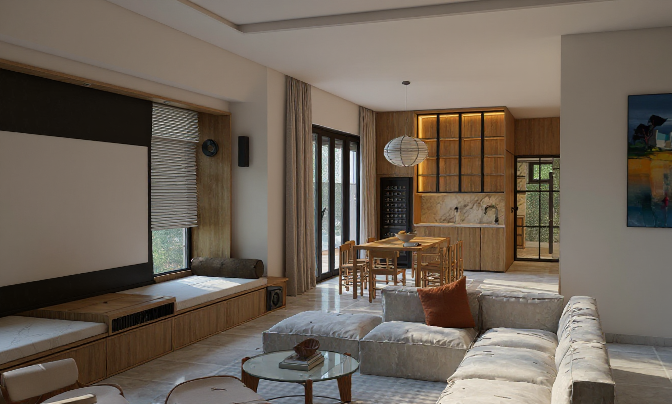 morning sunlight soft illumination turn on lights inside cabinet spotlights on ceiling light grey marble flooring