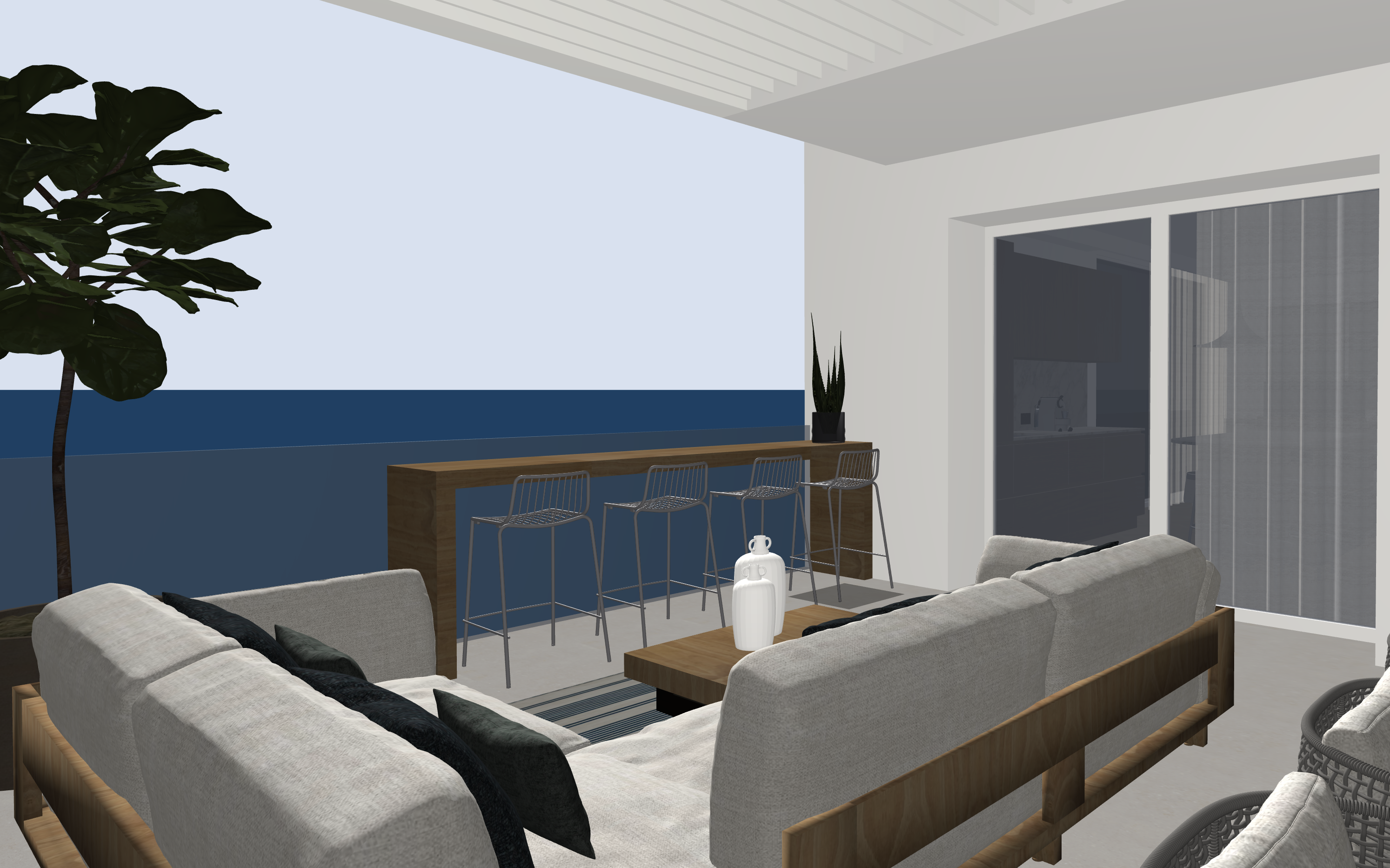 terrazza con divano in tessuto bianco caldo struttura in legno teak e cuscini sui toni del blu scuro tavolino e banco sgabelli in legno teak gli sgabelli sono cromati nella pergotenda sopra al divano c una strip led incassata perimetrale accesa il parapetto della terrazza in vetro il parapetto della terrazza in vetro metti uno sfondo con case e chiome di alberi e il mare in lontananza al tramonto metti qualche oggetto per ambiente conviviale esterno
