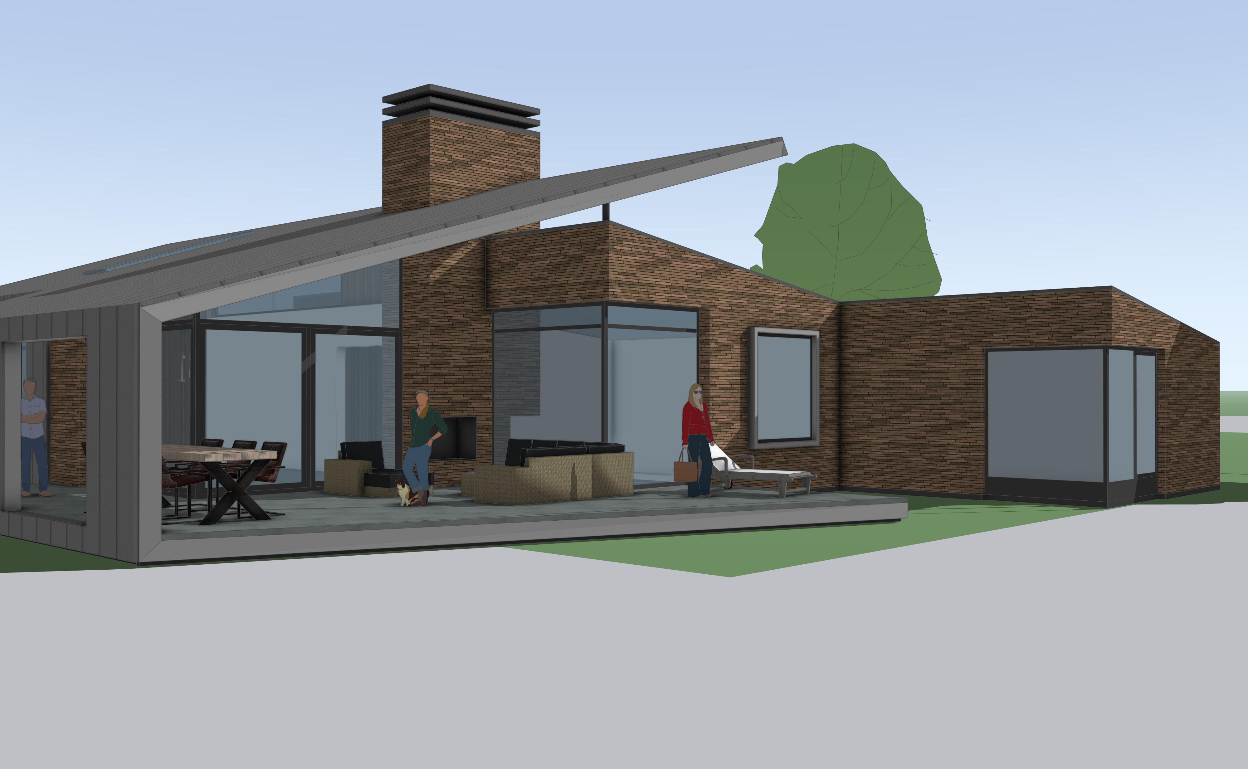 the house is surrounded by a lush green garden with grass bushes flowers and a lot of trees the weather is sunny with a few clouds in the sky