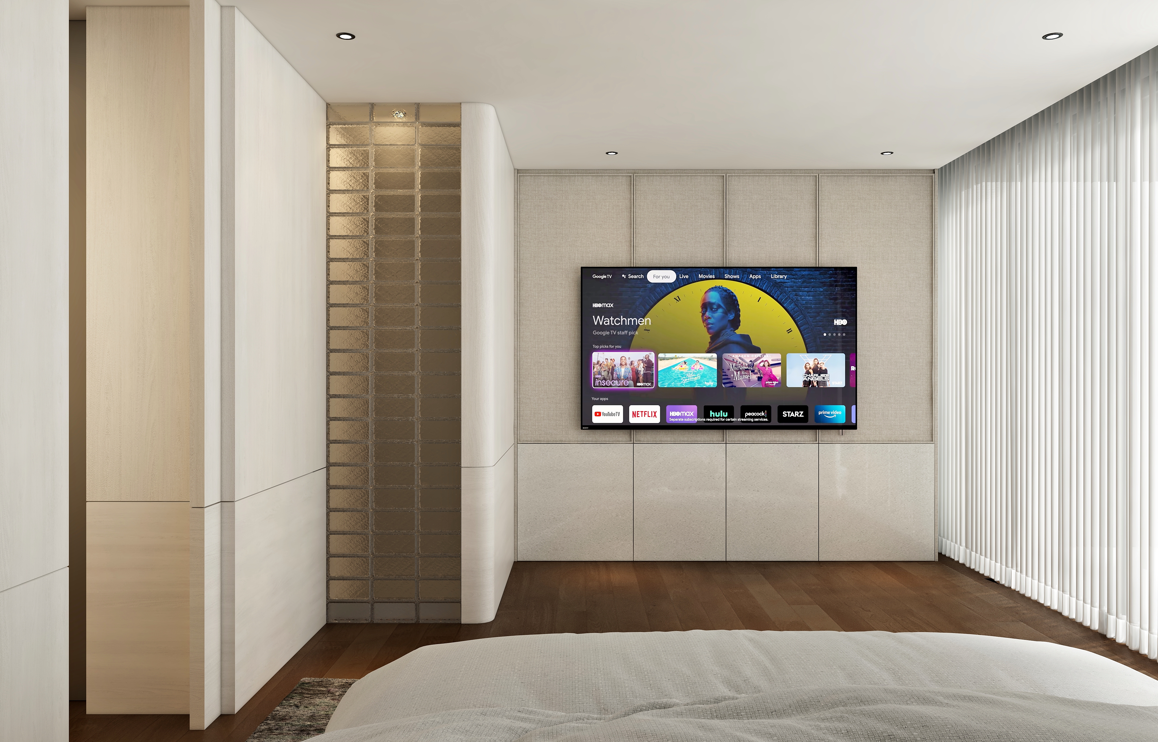 3000k light for the interior and put armchair at the left corner