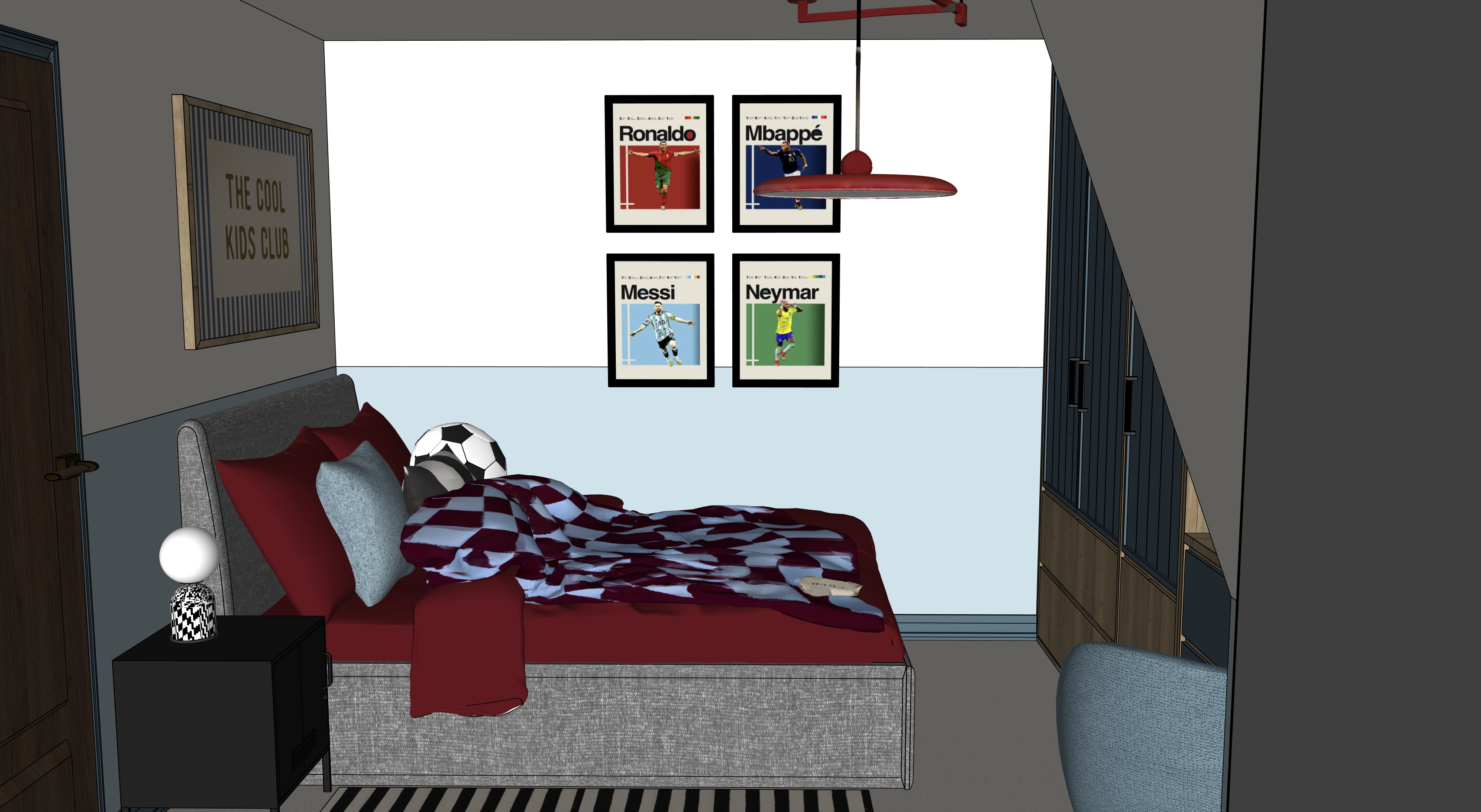 boys bedroom with a scan vibe off white ceilings and tops of walls muted baby blue bottom of walls muted mid denim blue skirting boards door frame and wardrobe doors warm grey oak tones soft furnishings and pops of colour along with layered lighting creates a luxe space for interior design clients architecture