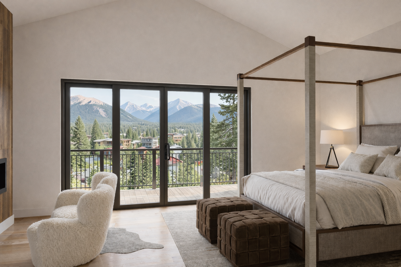 make this image look photorealistic and add some accessories to the bed and chairs like neutral textural throw blankets and a candle on the nightstand