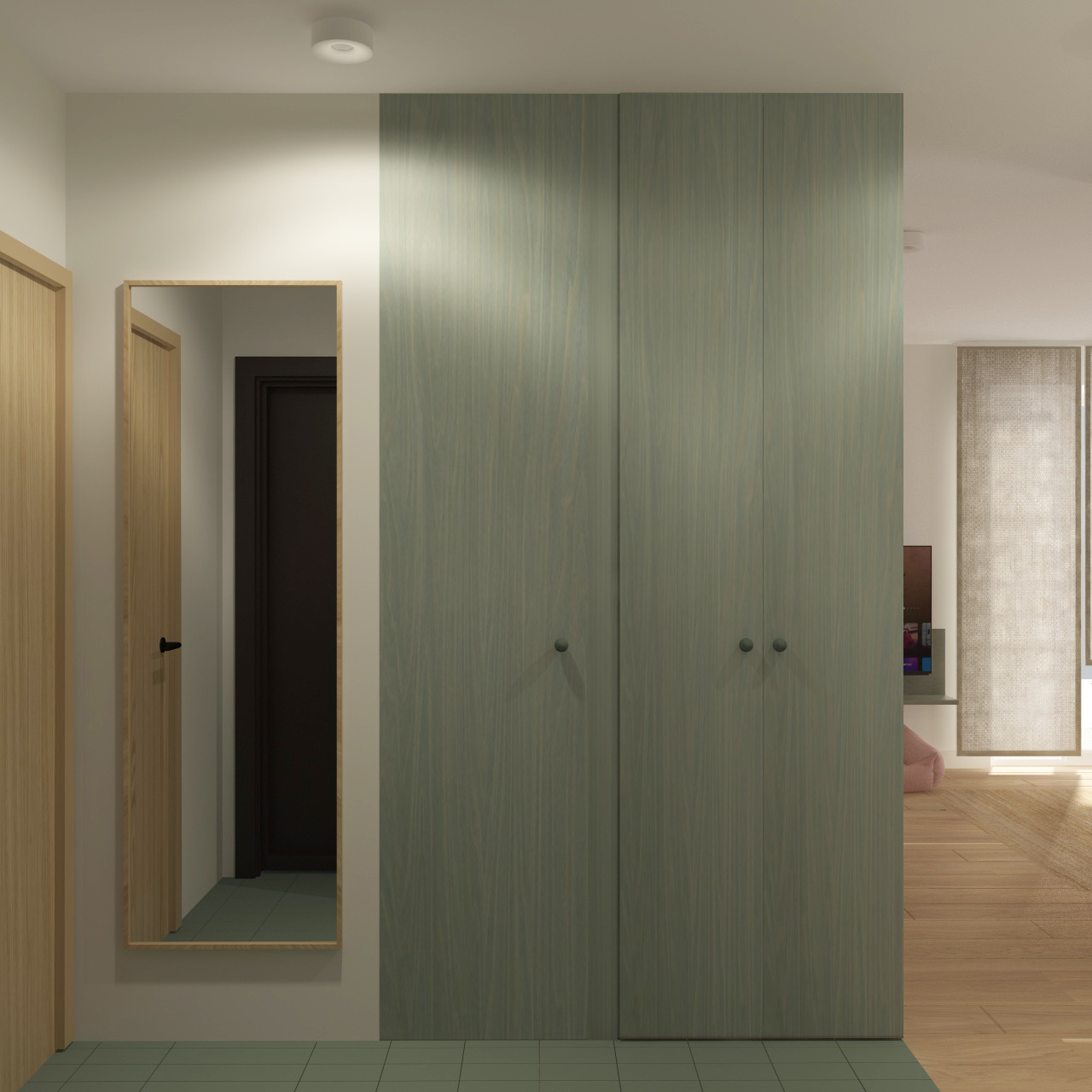 enhance the photorealism of this architectural visualization while preserving the design exactly as it is do not alter any materials colors textures finishes furniture layout proportions or architectural elements maintain all existing material tones and surface characteristics precisely as shown improve realism strictly through lighting and rendering refinement physically accurate artificial lighting simulation natural daylight entering from the background with correct light temperature separation realistic global illumination and secondary light bounce high dynamic range lighting hdr with balanced exposure soft natural contact shadows accurate ambient occlusion in corners and object intersections subtle physically correct reflections refined material roughness without changing material type or color micro contrast enhancement for surface depth extremely subtle surface imperfections fine micro variation only no texture change very delicate natural depth of field cinematic but neutral color grading no color shift no stylization ensure correct light interaction between artificial interior lighting and daylight from the background preserve the original atmosphere and composition no redesign no restyling no object modification final result should resemble a high end professional architectural photograph ultra realistic natural optically accurate well balanced and physically plausible the tiles are matt