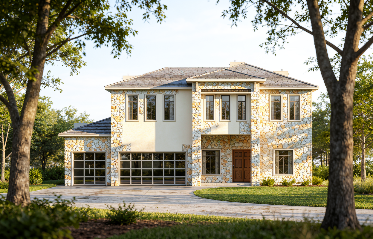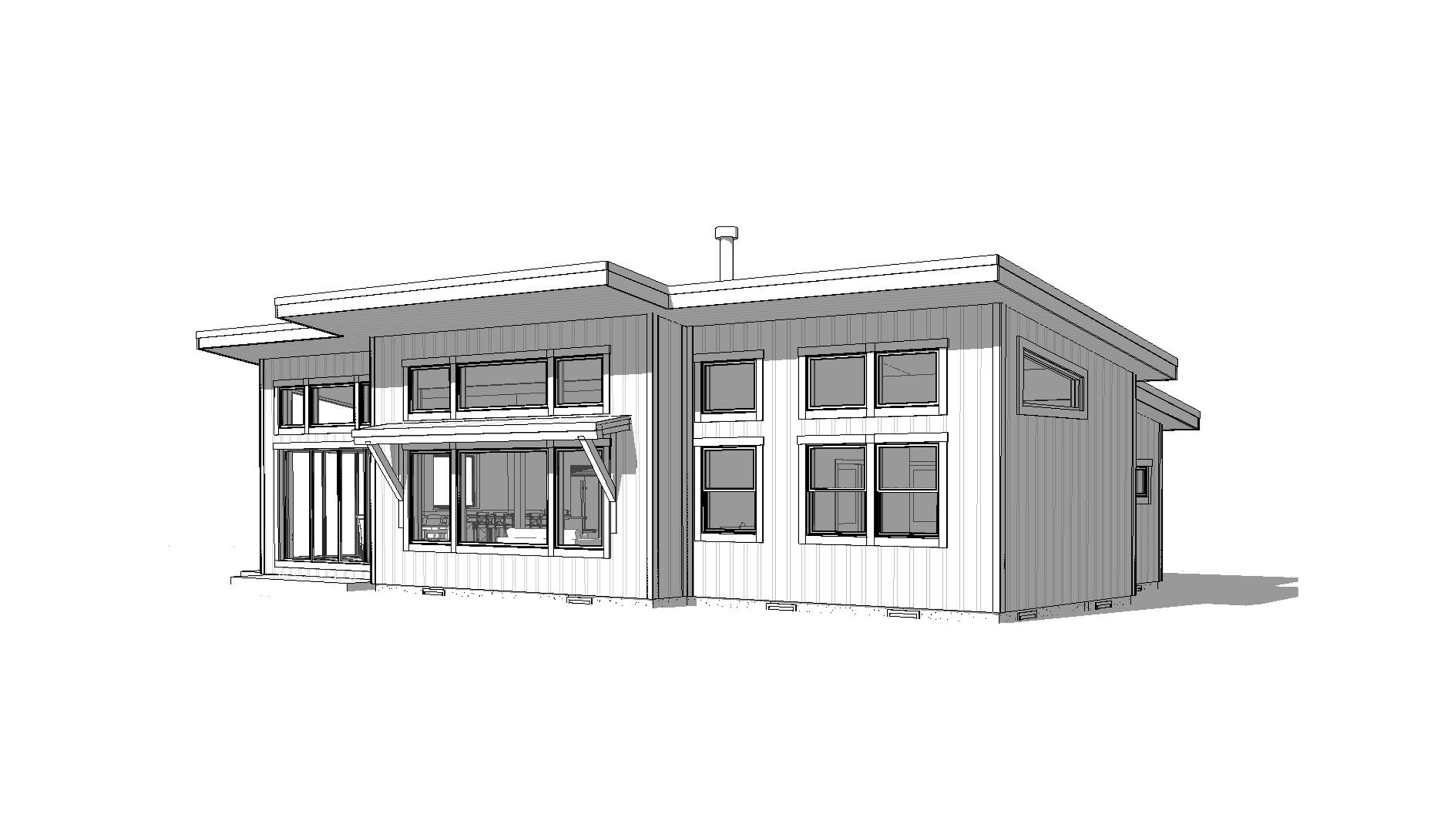 rear view of a clean architectural exterior home rendered in cinematic golden hour lighting with blue skies and sun streaks hitting the structure home in a mountain setting with faint streaks of light coming through trees in the surrounding area warm glow and mountain reflections off of the windows select grade vertical wood siding green manicured landscape around structure with gardens and patches of grass black standing seam metal roof prominent trees in the background high fidelity photorealistic visualization crisp shadow falloff refined facade geometry soft atmospheric depth premium architectural photography mood ultra clean composition and materials black window trim flat roof photorealistic render black window trim
