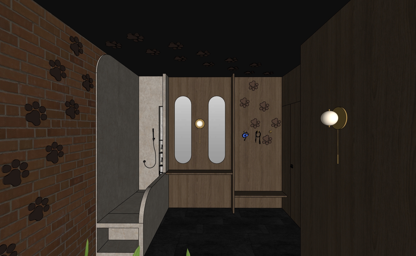 render a stylish entryway with a modern and cozy atmosphere the walls are covered in rich dark walnut wood panels the light fixtures are glowing warm white providing soft illumination include a luxurious black tiled floor with subtle hints of charcoal enhancing the depth highlight minimalist black fixtures for a contemporary touch add playful decorative elements shaped like paws on the ceiling keep the lighting ambient and inviting