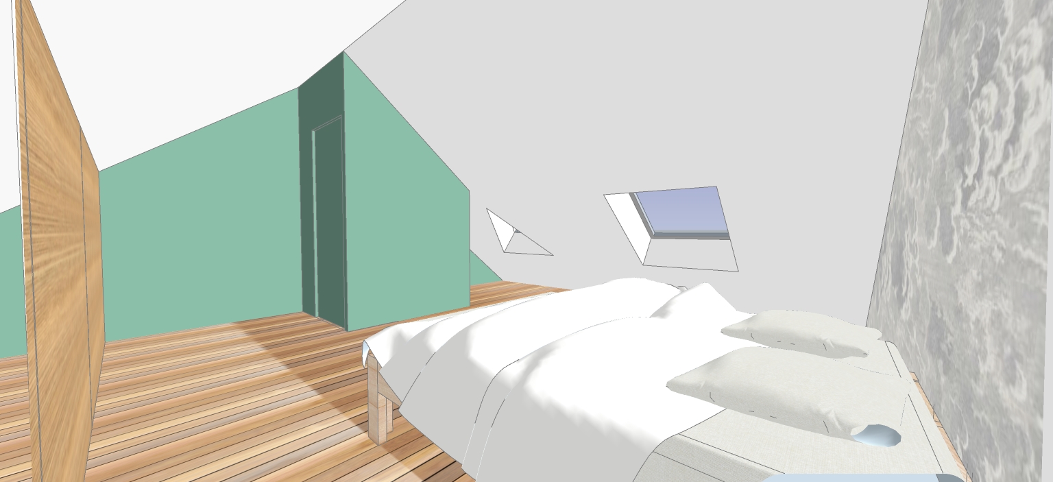a modern minimalist bedroom with a calming atmosphere the room features a light wooden floor with natural grains the walls are a soft mint green complemented by a smooth white ceiling the bed has an inviting white comforter and pillows a textured wall creates depth and interest with subtle marble patterns in soft gray tones sunlight streams through triangular windows casting gentle shadows render the scene with a serene cozy ambiance using natural light to highlight the room s sleek clean lines