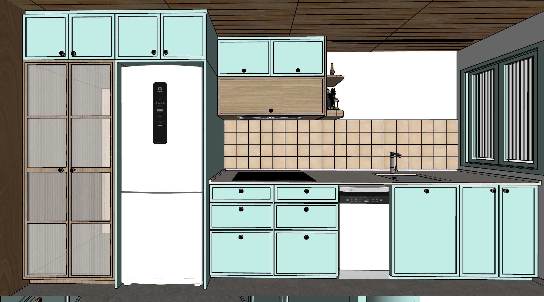tiles are semi gloss with a peachy tone floor is matt ceramic no grouts use warm evening light add warm led strip 3000k under the wooden overhead cabinet only the glass in the cabinet is striped green cabinets are painted mdf with plain matt finish door handles are matt golden make it classical and comtemporary