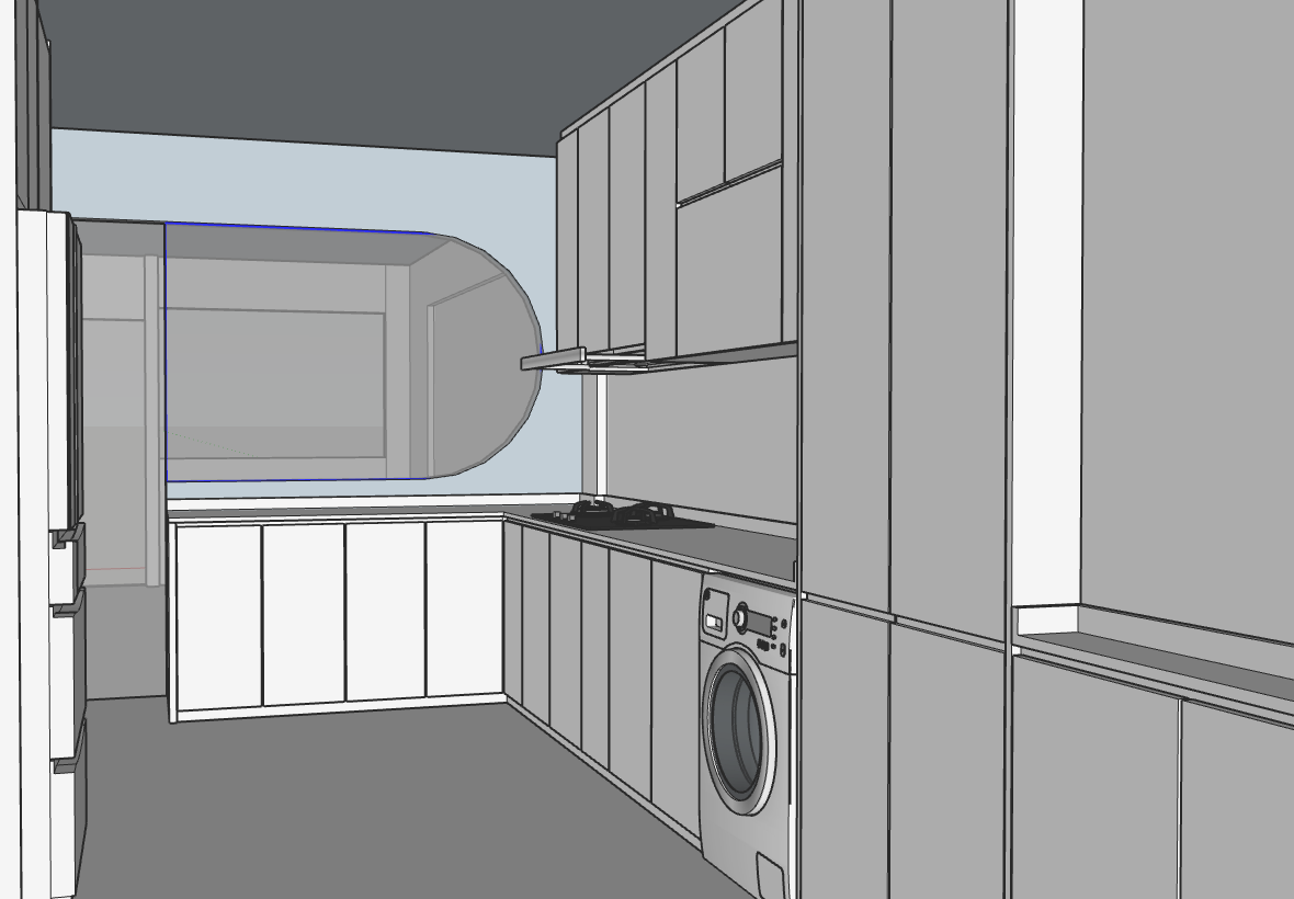 exterior shot render a modern kitchen with sleek minimalist design the cabinets are matte white complemented by silver metallic handles the countertops are quartz with a subtle marble pattern in shades of light gray the stove is glossy black and the washing machine is stainless steel with an elegant finish the floor is polished light oak wood adding warmth to the scene the walls are painted a soft dove gray while the ceiling is a crisp clean white large windows let in natural light creating a bright and open atmosphere add a few potted green plants for a touch of nature and freshness